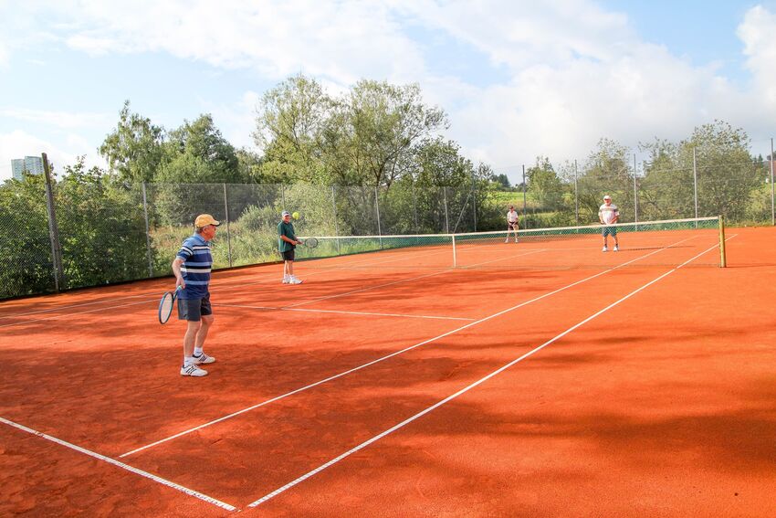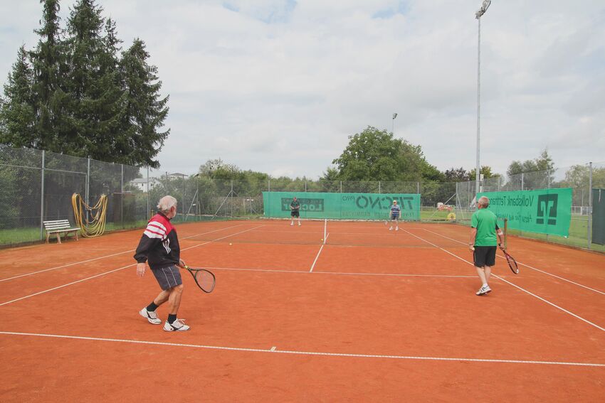 Gleich hinter den Sportplätzen im Ried sind die vereinseigenen Tennisplätze, wo die Tennis-Abteilung des TSV den gelben Filzbällen nachjagt.