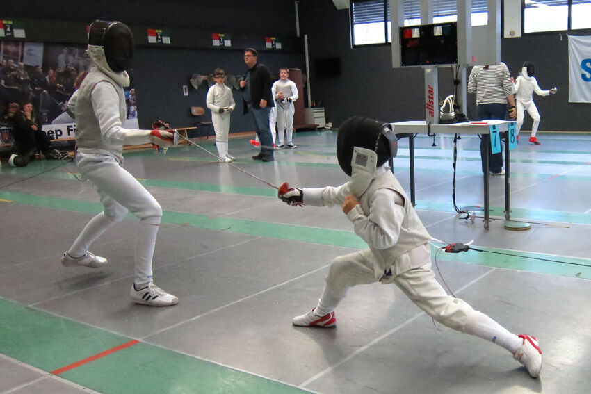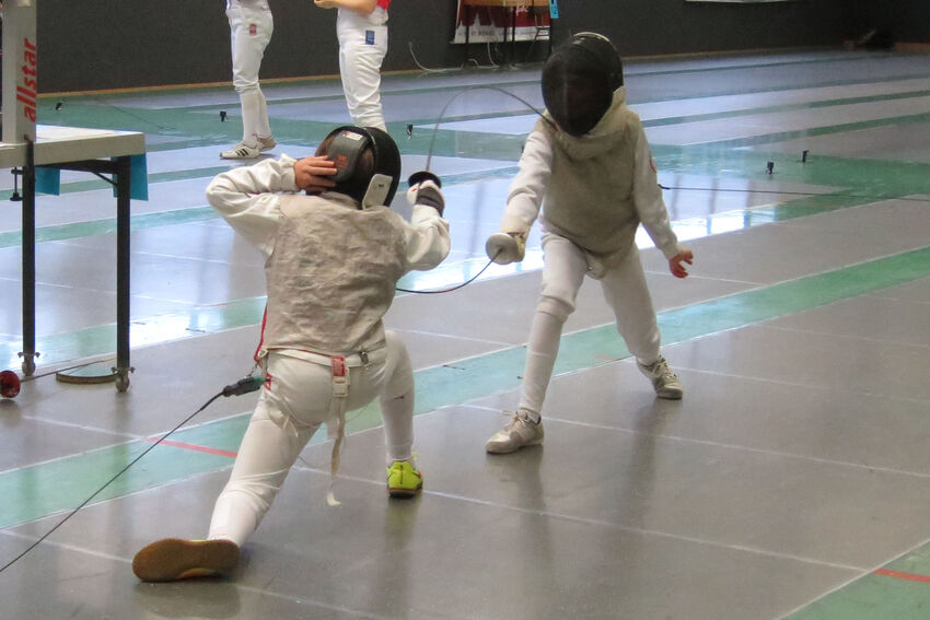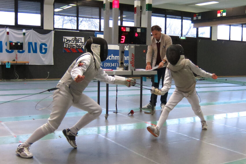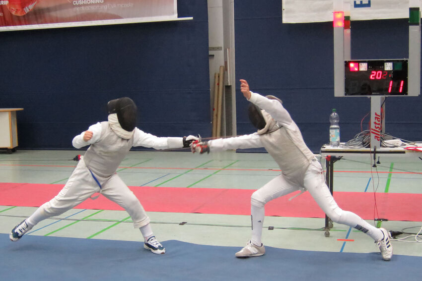 Die Equipe des Montfort Gymnasiums durfte sich als RP-Sieger mit einer Mannschaft aus Tauberbischofsheim und einer aus Baden Baden messen. Erfreulich ruhig und konzentriert gingen Lena Kirschbaum, Alexander Neumeister, Tobias Reutter und Finn Wattenbach gegen die Tauberaner in die Gefechte, trotzdem bauten diese ihre Führung kontinuierlich bis zum Sieg aus. Nun war ein Sieg gegen Baden Baden notwendig, um noch in das kleine Finale einziehen zu können. In einer sehr fairen Partie ließen die Montforter gegen die teilweise jüngeren Fechter nichts anbrennen und gewannen dieses Match klar mit 45:5. Der Weg zum dritten Platz konnte nun nur über das favorisierte Schulzentrum am Wört Tauberbischofsheim führen und diesen Weg schlugen die Tettnanger ein. In der Anfangsphase waren die Ergebnisse ausgeglichen und beim 15:13 führten die TSV-Fechter sogar. Die unter Druck geratenen Hausherren wollten die gestiegene Aufmerksamkeit für diese Partie wieder senken und nahmen nun eine Auswechslung vor. Der eingewechselte Fechter zeigte Wirkung und von nun an dominierte das Schulzentrum am Wört.