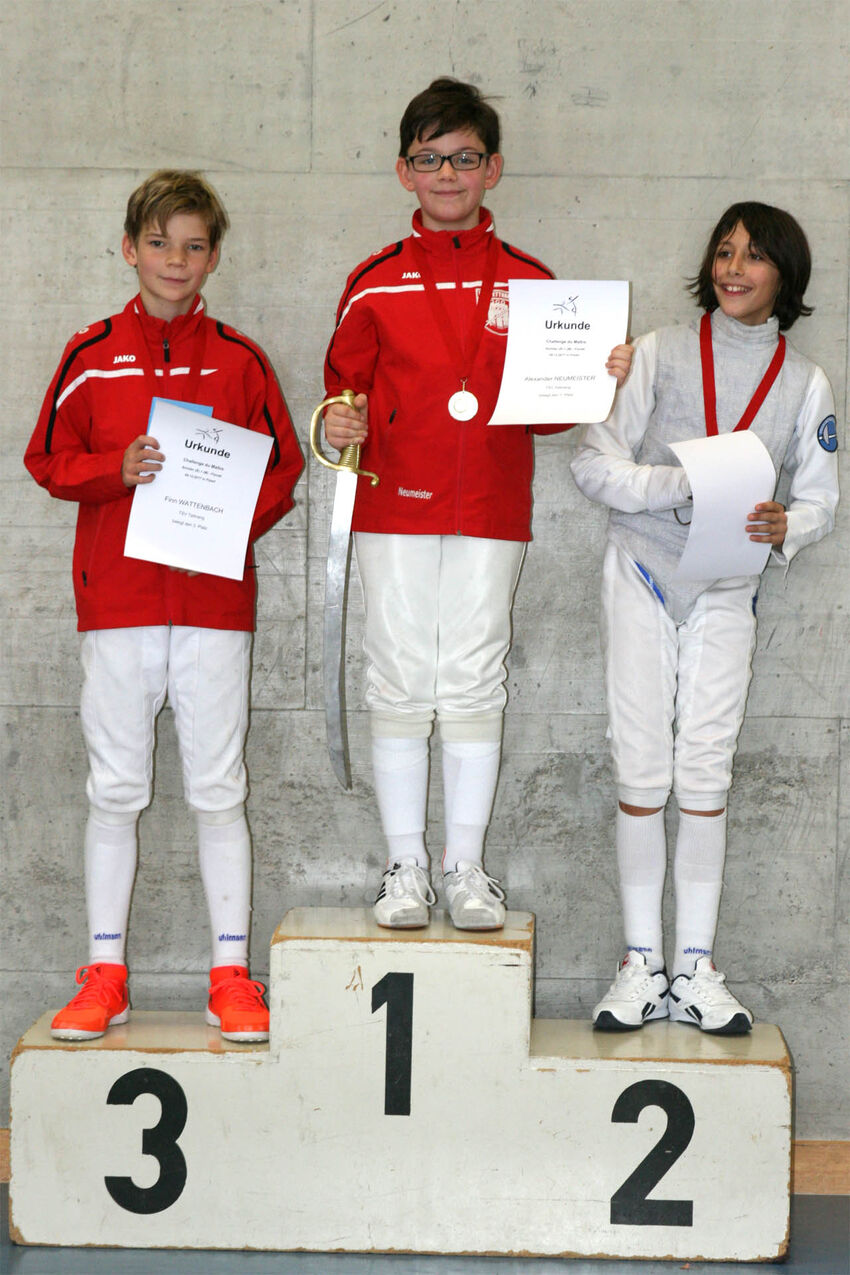 Die traditionsreiche Challenge du Maître ist seit diesem Jahr zum IBF-Ranglistenturnier für Florettfechter geworden. Neben den ausrichtenden Fechtschulen Flawil und Zürich des Maître Edouard Starzynski gaben sich in der Altersklasse U12 vergangenen Samstag auch Fechter vom FC Konstanz und TSV Tettnang die Ehre. Die elf Teilnehmer wurden in zwei Platzierungsrunden für die späteren K.o.-Finals nach den IBF-Ranglistenplätzen eingeteilt, so dass Finn Wattenbach als erster und Alexander Neumeister als zweiter in unterschiedlichen Gruppen starteten. Finn Wattenbach wurde seiner Favoritenrolle mehr als gerecht und gewann in seiner Fünferrunde alle vier Matches ohne einen einzigen Gegentreffer. Auch im Viertelfinale ließ er beim 10:1 keinen Zweifel an seiner Topform aufkommen. Alexander Neumeister startete gegen die spätere Siegerin der Damen in die Sechserrunde mit einer Niederlage. Auch die nächsten beiden Gefechte, bei denen er eine weitere Niederlage hinnehmen musste, liefen noch nicht rund. Dann hatte er seine Form wiedergefunden und sich mit drei Siegen und zwei Niederlagen für das Viertelfinale qualifiziert. Mit einem 10:2 unterstrich auch Alexander, dass es jetzt lief.