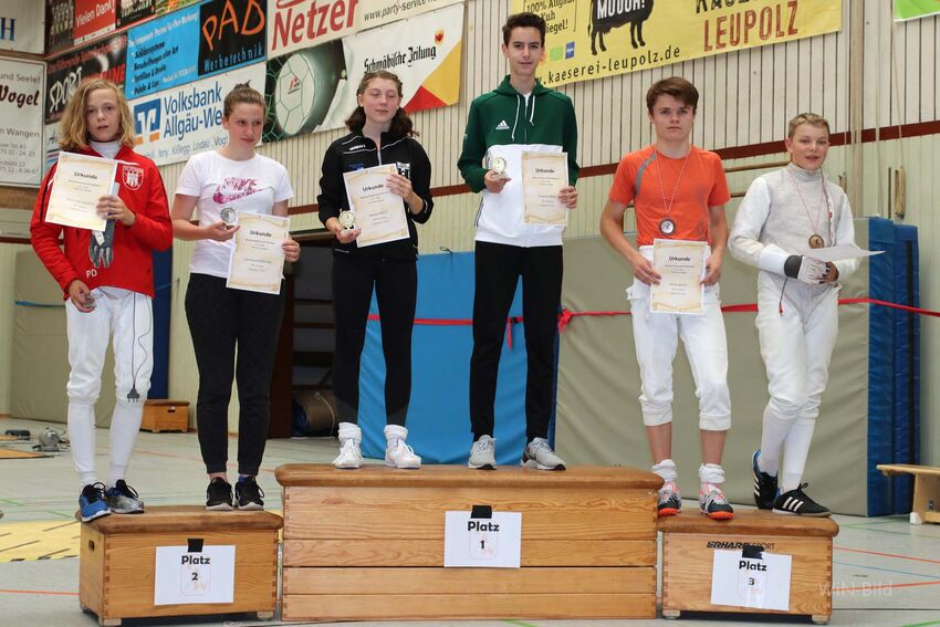 Am Sonntag kamen die Degenfechter von Laupheim bis Friedrichshafen nach Wangen, um ihre Besten zu ermitteln. Die Mädchen und Jungen der Klassen U9 bis U12 wurden in einem Wettbewerb zusammengefasst. Für Julia Neumeister war die Aufgabe dementsprechend groß, aber auch mit dem Degen konnte sie ein Match gewinnen und U9-Meisterin werden. Alexander Neumeister konnte sich durch die K.o.-Finals bis ins Finale fechten. Das bis zum entscheidenden letzten Treffer spannende Match entschied Dario Knör vom VfB Friedrichshafen für sich. Da jeder der beiden Finalisten zugleich der Beste seines Jahrgangs war, gewann Knör die U12- und Neumeister die U11-Meisterschaft.