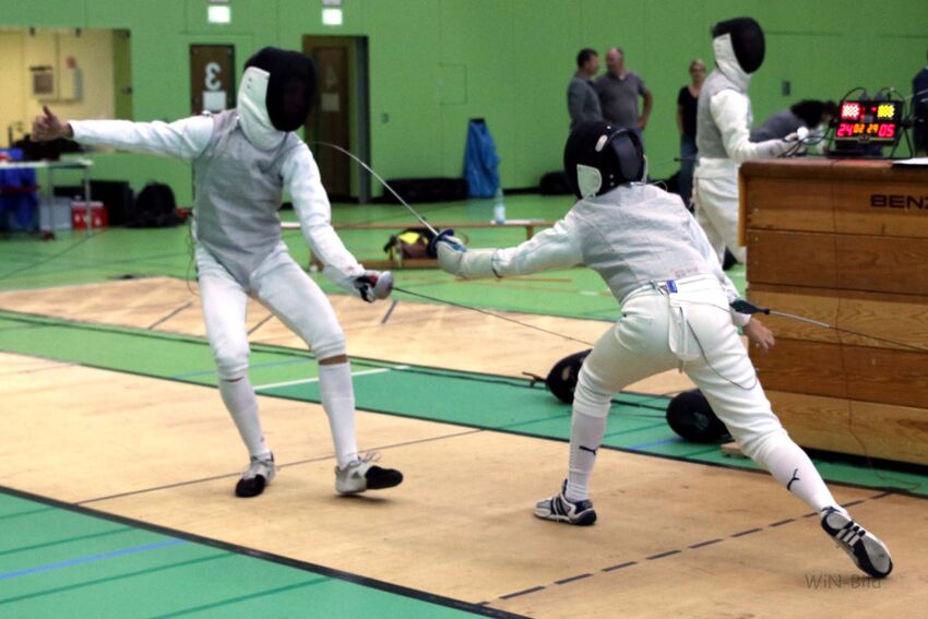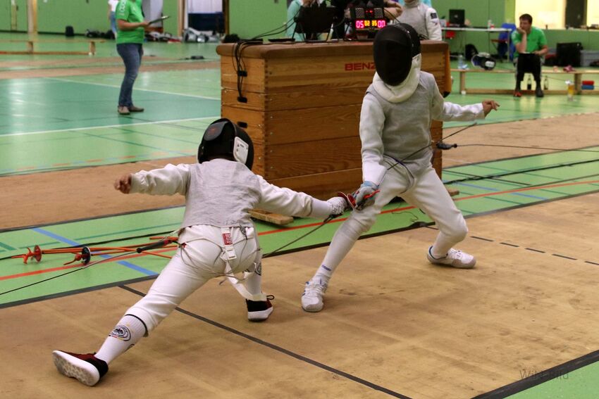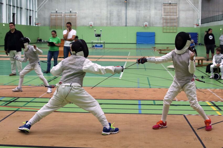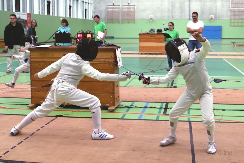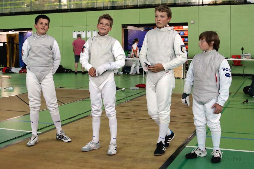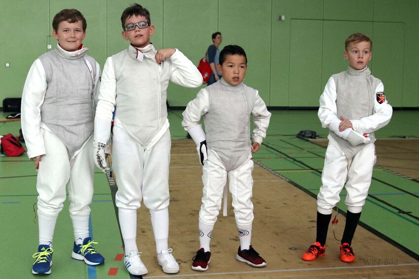 Den Anfang machten vergangen Samstag die Jüngsten in der U12-Klasse, bei denen Tettnang sowohl ein Jungen- als auch ein Mädchen-Team ins Rennen schickte. Das aus den erfahrenen Fechtern Winston Cheng und Alexander Neumeister und den beiden Turnierneulingen Maximilian Kiechle und Paul Stohr neu gebildete Team funktionierte von Anfang an. Nach deutlichen Siegen in den ersten Mannschaftkämpfen kam es in der dritten Begegnung zum Treffen mit dem ebenfalls ungeschlagenen Team „TG Biberach 2“. Bis zum vorletzten Gefecht lagen die Gastgeber um sieben Treffer vorn, ehe Cheng auf 32:37 verkürzte. Neumeister nutzte die Kampfzeit von drei Minuten, um zu einem 42:42 auszugleichen, ehe er in der Verlängerung den Treffer zum Meistertitel setzte.
