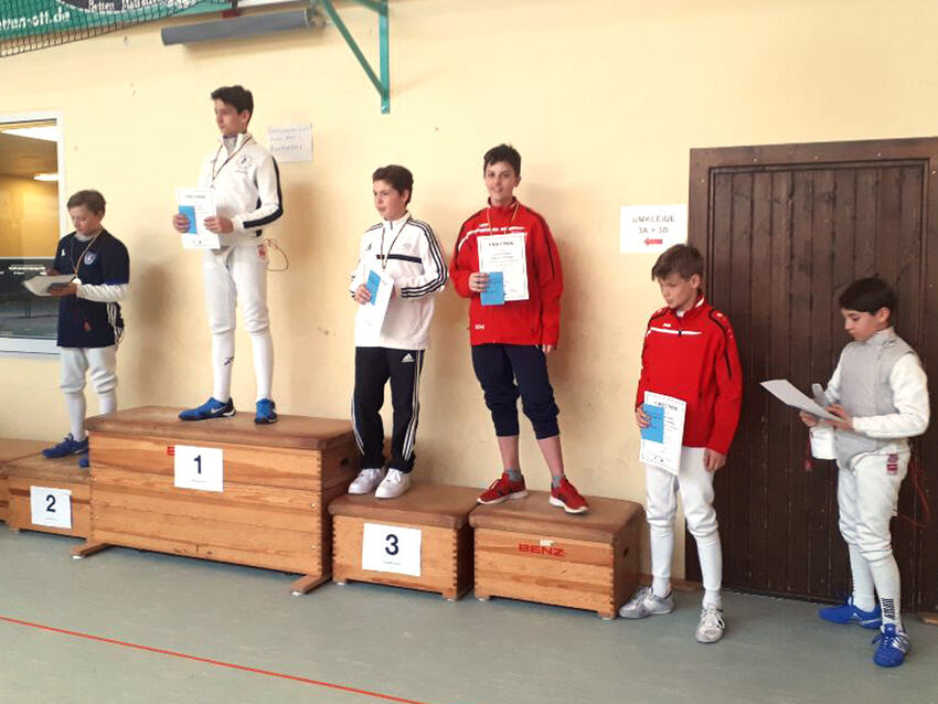 Vor größeren Überraschungen durch ihre guten WFB-Ranglistenplätze geschützt, gingen Noel Rilling und Finn Wattenbach ruhig und konzentriert in ihre U13-Vorrunden. Beide konnten sich in den Gefechten gut behaupten und mit drei Siegen konnte sich Rilling den aussichtreichen sechsten Stetzplatz für die K.o.-Finale herausfechten. Noch besser lief es für Wattenbach, der mit vier Siegen nur eine Niederlage hinnehmen musste und Dritter der Setzliste wurde. Allerdings warf diese Konstellation auch einen Schatten voraus - sollte keiner zuvor ausscheiden, mussten die beiden Tettnang im Viertelfinale aufeinander treffen. Beide schafften den Einzug ins Viertelfinale und fochten nun um den verbliebenen Platz im Halbfinale. In einem spannenden und denkbar knappen Match ging mit einem Treffer Vorsprung erst bei Zeitablauf Noel Rilling als Sieger von der Planche. Das folgende Halbfinal konnte der Tauberbischofsheiner Ivo Wundling für sich entscheiden und Noel beendete die Meisterschaft als Dritter auf dem Treppchen.