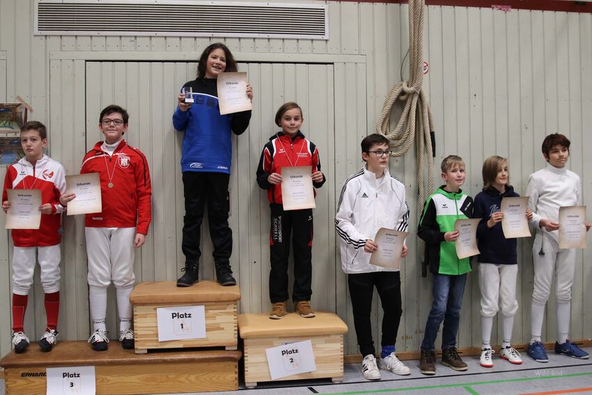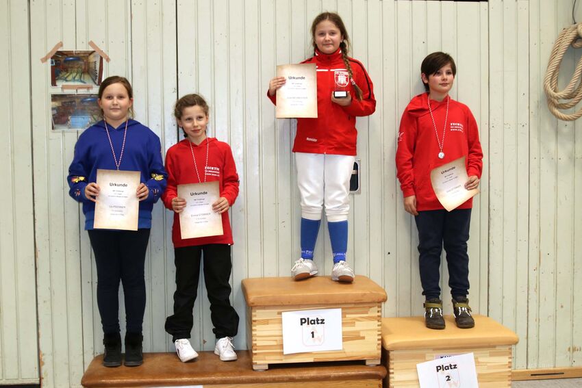 Das Turnier eröffneten die Jüngsten und die gut aufgelegte Julia Neumeister gewann in der gemeinsam mit den Jungen ausgetragenen Florett-Konkurrenz die Vorrunde bei nur einem Gegentreffer. Auch nach der Zwischenrunde führte die Tettnangerin das Feld an und sicherte sich damit frühzeitig den Turniersieg, da sich für das Finale mit ihr ein Junge qualifizierte. Die Umstellung auf den Degen klappte nicht reibungslos, so dass sich Julia als Dritte für die Direktausscheidung qualifizierte. Im Halbfinale lieferte sie sich mit ihrer auf die Zwei gesetzten Gegnerin aus Dornbirn ein spannendes Match, ehe sie den entscheidenden letzten Treffer setzte. Im Finale wartete eine weitere Fechterin vom Landeszentrum Vorarlberg, die sich in der ersten Hälfte eine kleine Führung aufbauen konnte. Aus der Pause kam die Tettnangerin sehr offensiv zurück und konnte Treffer um Treffer bis zum zweiten Turniersieg des Tages erzielen.