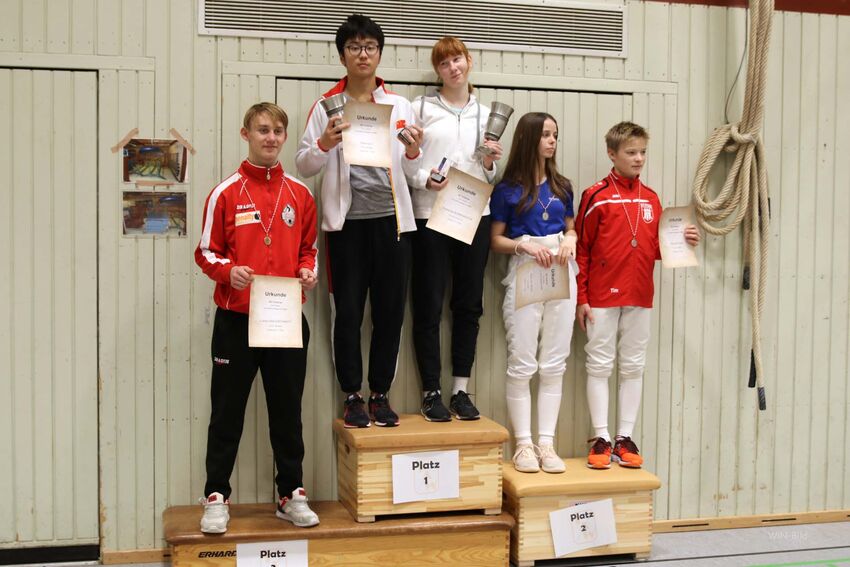 Obwohl Tim Kästner in der U17 startet, ist er mit erst einem Jahr fechterischer Erfahrung Tettnangs Youngster. Die fehlende Routine machte Tim mit Talent und Einsatz wett und gewann überraschend im Halbfinale gegen einen der beiden Wangener Lokalmatadoren. Im Finale beanspruchte der Wahlwangener und chinesischer Kaderfechter Li den Pokal für sich und Tim Kästner belegte den zweiten Platz.
