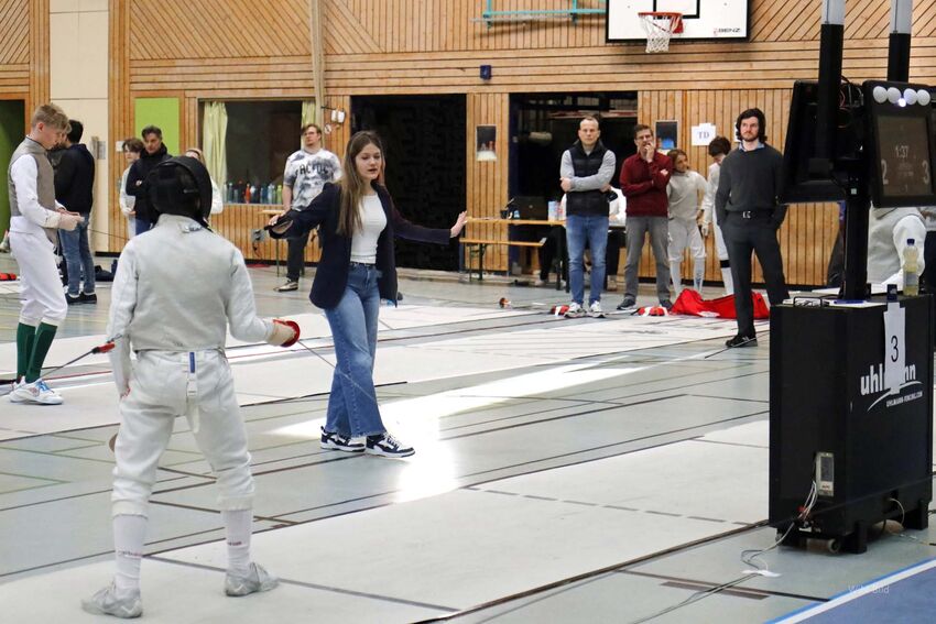 Während der U15-Vorrunden der Herren jurierte Julia Neumeister als Prüfungskandidatin. Mit der altersklassebeschränkten Landeslizenz „E“ ausgestattet, ging es nun darum, vertiefte Regelkenntnisse zu demonstrieren. Nur so kann die Altersklassenbeschränkung aufgehoben werden, die der Fünfzehnjährigen bisher erlaubt, ausschließlich jüngere Altersklassen zu jurieren. Als auch die Direktausscheidungsgefechte ohne Beanstandung absolviert wurden, durfte zur bestandenen D-Lizenz gratuliert werden.