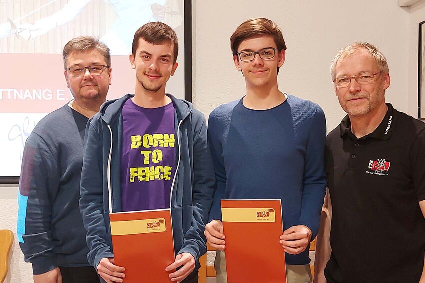 Ein weiterer Höhepunkt der Versammlung war die Auszeichnung der beiden sehr engagierten und verdienten Jungfechter Noel Rilling und Alexander Neumeister mit der TSV-Bronze-Nadel. Beide sind seit über 10 Jahren bei Landesmeisterschaften mit Titeln und Medaillen für den TSV Werbeträger, als Schiedsrichter auf Landesniveau und im Training als frisch gebackene „C-Trainer Leistungssport“ für ihre Fechtabteilung im Einsatz. Kader- und Landesauswahlnominierungen sowie Jugendsprecher und Warte-Ämter in der Abteilung würden der Laudatio des TSV-Geschäftsführers Harald Franzen folgend auf Personen im gesetzten Alter hindeuten und damit das außergewöhnliche Engagement dieser beiden 18-Jährigen unterstreichen!