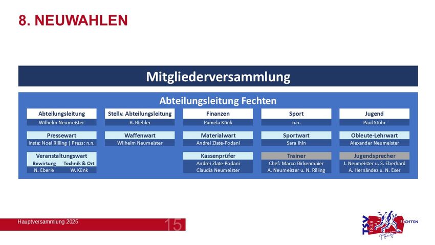 Zur Neuwahl als Abteilungsvorstände stellte sich Wilhelm Neumeister (Abteilungsleitung), Dr. Björn Biehler (Stv. Abteilungsleitung), Pamela Künk (Finanzen) und Paul Stohr (Jugend), das Ressort “Sport” blieb aufgrund eines vorübergehenden Auslandstudiums des bisherigen Inhabers Luis Kramer unbesetzt. Die Kandidaten wurden in die Ämter gewählt und nahmen diese an, sodass die Referatsinhaber “Geschäftsführung”, “Finanzen”, “Sport & Jugend” abgewählt und als Abteilungsvorstände Abteilungsleiter, Stv. Abteilungsleiter, Finanzen und Jugend gewählt wurden. Die sich zur Wahl gestellten Kandidaten für die Positionen der Warte wurden en bloc ins Amt gewählt (Organigramm, siehe Bilder).