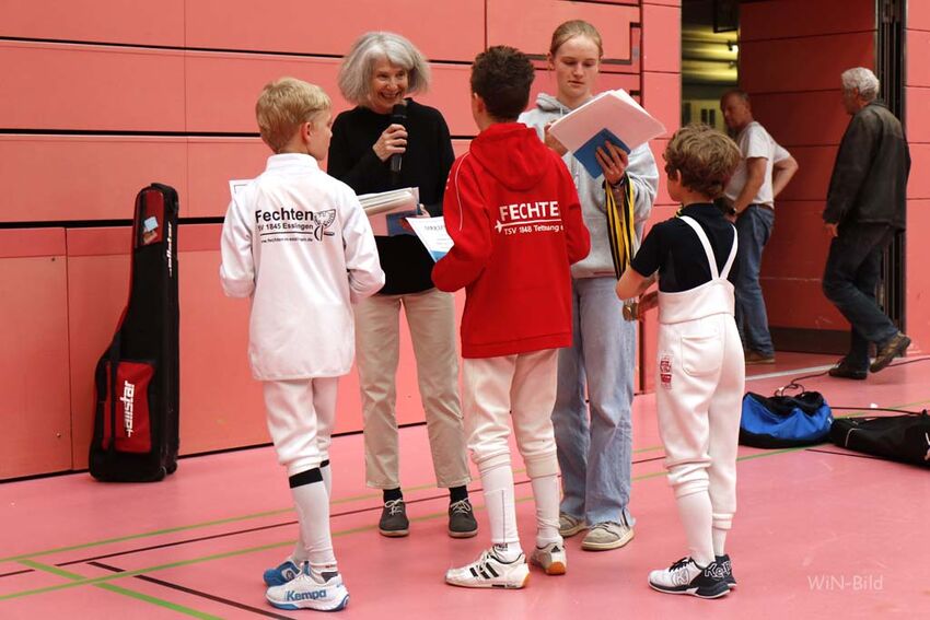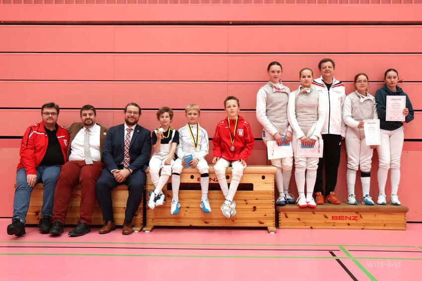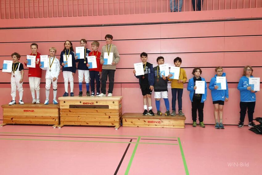 In Tübingen standen die beiden letzten Florett-Landesmeisterschaften der Saison für die Altersklassen U11 und U15 an. Bisher war die Saison für die TSV-Fechtjugend sehr gut gelaufen – nach dem Vorjahresrekord von einem Dutzend DM-Qualifikationen ging man nun mit neun ins letzte Turnier. Auch die U11-Team-Bronzemedaille galt es für Niclas Künk in der Startgemeinschaft mit Esslingen zu verteidigen, da die Vereinskollegen in die U13 gewachsenen waren. Im Einzel schlug sich der Tettnanger in der Vorrunde mit dem späteren Landesmeister beachtlich und stieg in die Direktausscheidung auf. Mit einem sicheren Sieg ging es ins Viertelfinale, in welchem die Führung mehrfach wechselte. Beim Stand von 9:9 musste der nächste Treffer entscheiden und der Tettnanger traf – allerding auf den Oberarm und nicht auf den im Florett notwendigen Rumpf. Die nächste Attacke des Gegners fand das Ziel, sodass Niclas Künk Platz sieben belegte und dieses wertvolle Ergebnis in den Setzplatz des Teams einbringen konnte. Zusammen mit Karl Marth und Jonathan Dörfler aus Esslingen ging es an drei gesetzt gegen den leicht favorisierten TV Cannstatt. In der Stafette baute Cannstatt den Vorsprung bis zum 23:35 Treffer vor dem vorletzten Gefecht aus. Sehr vorsichtig tastete der Tettnanger sein Gegenüber ab, bis er den ersten Treffer setzte. Der zweite Streich folgte nach einer kurzen Vorbereitungsaktion und dann setzte Niclas Künk von der Bank angefeuert zur sensationellen 16 Treffer-Ralley zum 39:39 an. Karl Marth vollendete mit 45:41 den Finaleinzug und am Ende den Landesvizemeistertitel hinter dem PSV Stuttgart.