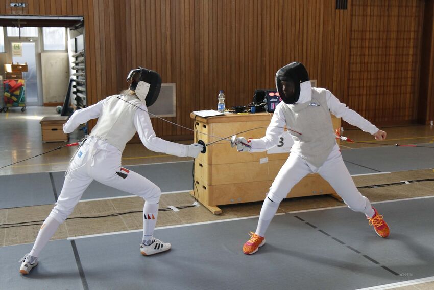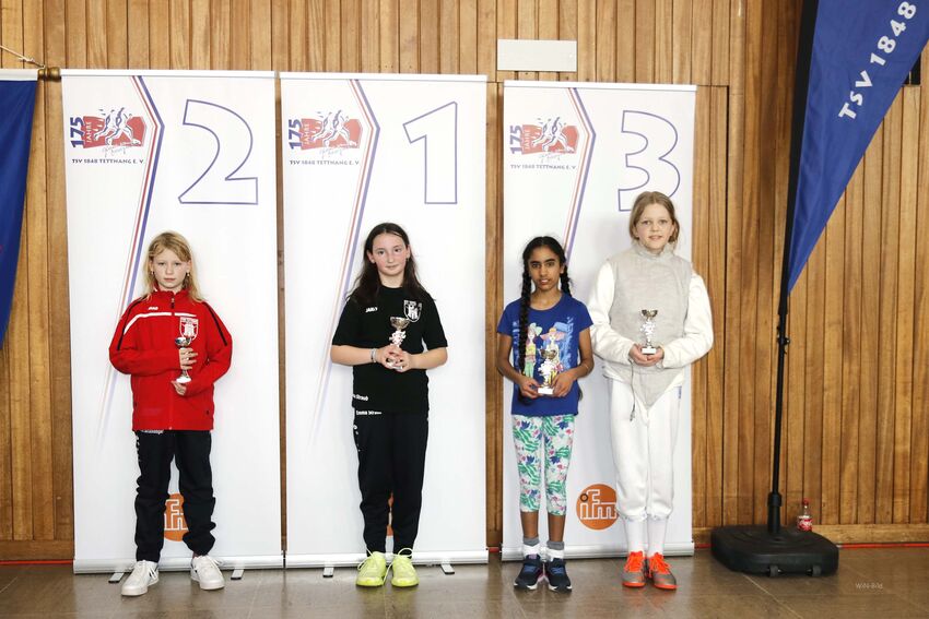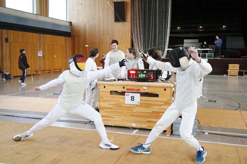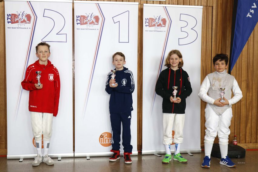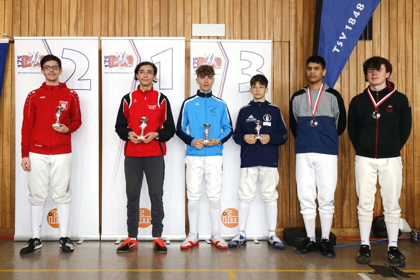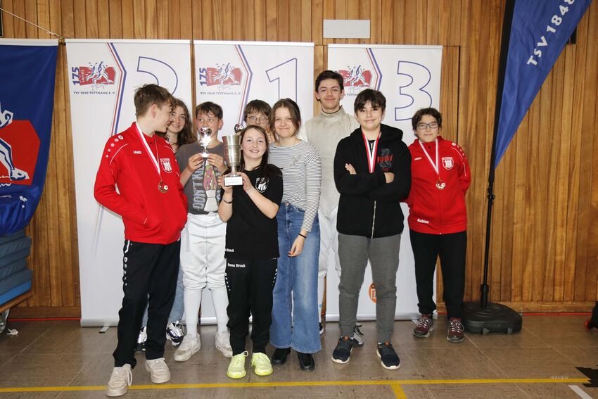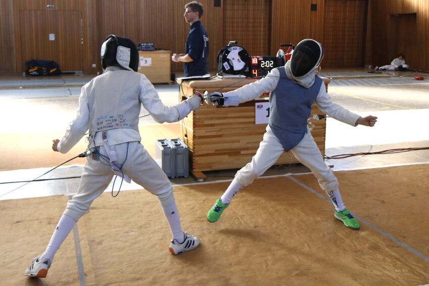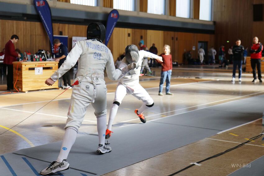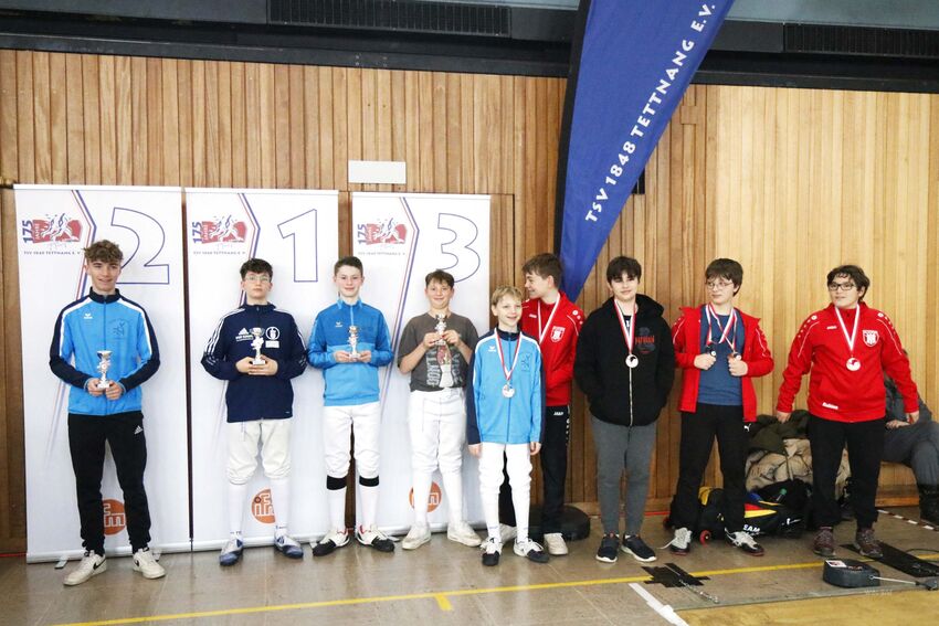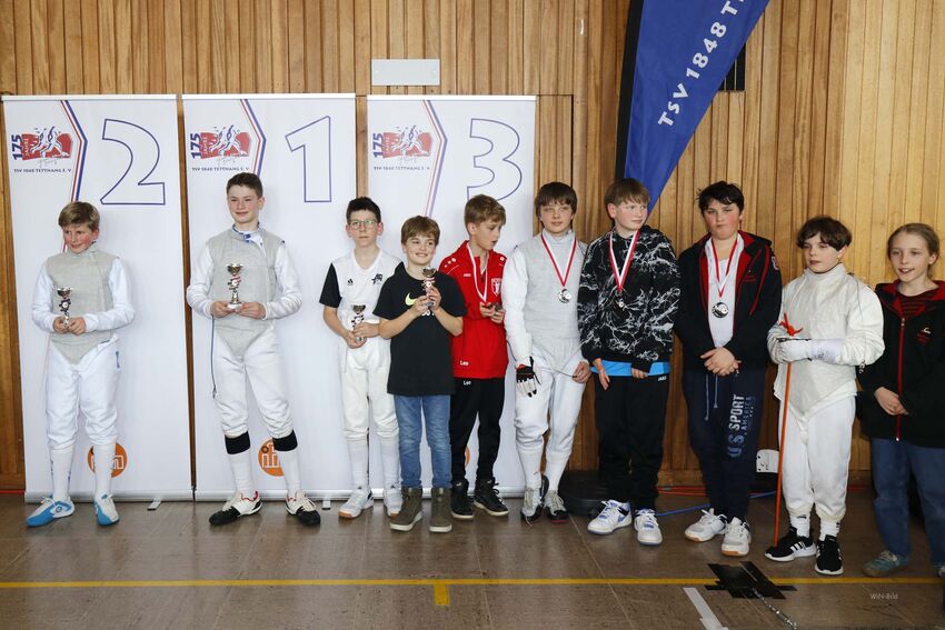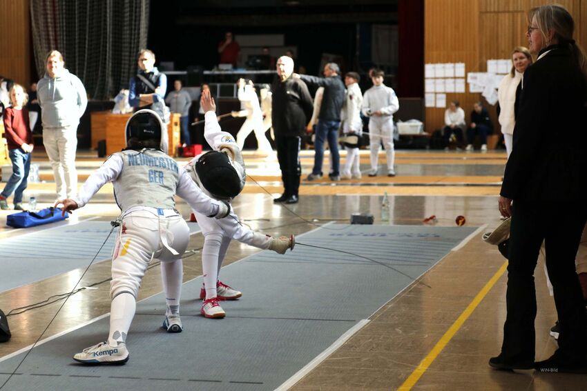 Für die Gastgeber legte die jüngste Altersklasse U11 die Messlatte hoch. Bei den Mädchen kamen die beiden Lokalmatadorinnen Zoe Stratkemper und Emma Straub als Erste bzw. Dritte sehr gut platziert aus den Vorrunden in die Direktausscheidung. Ihr Halbfinale gewann Zoe Stratkemper sicher, während Emma Straub sich im anstrengenden Match gegen die Zweitplatzierte aus Biberach ihren Sieg erarbeiten musste. Das vereinsinterne Finale blieb bis zuletzt hochspannend – bei Zeitablauf und nach der Verlängerung stand es 7:7, sodass der vor der Verlängerung ausgeloste Vorteil Gold für Emma Straub und Silber für Zoe Stratkemper bedeutete. Bei den Jungen empfahlen sich Niclas Künk als Zweiter und Erik Zlate-Podani als Vierter für die K.o.-Finale. Im Halbfinale kam für Zlate-Podani das Aus gegen den auf Eins gesetzten Fechter des PSV Stuttgart, gegen den Künk nach seinem ungefährdeten Sieg im Finale antreten sollte. Ein spannender Zweikampf fand beim 10:6 mit Alessandro Kiel den Sieger und mit Niclas Künk den Silbermedaillengewinner, der von Erik Zlate-Podani mit der Bronzemedaille aufs Podest begleitet wurde.