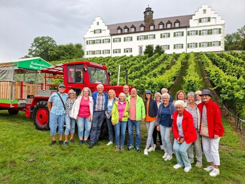 Ein interessantes Gefährt erwartete die Teilnehmer/innen und ein besonderer Mercedes-Traktor mit einem Anhänger auf dem die Gruppe Platz nahm. Los ging die Fahrt durch Obstplantagen bis zum ersten Weinberg. Dort wurde ein Müller-Thurgau verkostet. Herr Siebenhaller erzählte die Geschichte dazu. Beim nächsten Halt wurde ein fruchtiger Weißherbst kredenzt der allen vorzüglich mundete. Über dem See tauchte eine bedrohliche schwarze Wolke auf, die der guten Stimmung aber nichts anhaben konnte. Der letzte Halt war unterhalb des Schlosses Hersberg. Hier wurde noch ein besonderer Gewürztraminer probiert, golden im Glas mit vielen Aromen. Der Gastgeber unterhielt die fröhliche Truppe mit Anekdoten und Geschichten, z.B. wie man die Rebsorten an den verschiedenen Blättern erkennen kann. Bei einsetzendem Regen ging es zurück zur Besenwirtschaft um dann gestärkt wieder die Heimreise mit dem Bus anzutreten.
