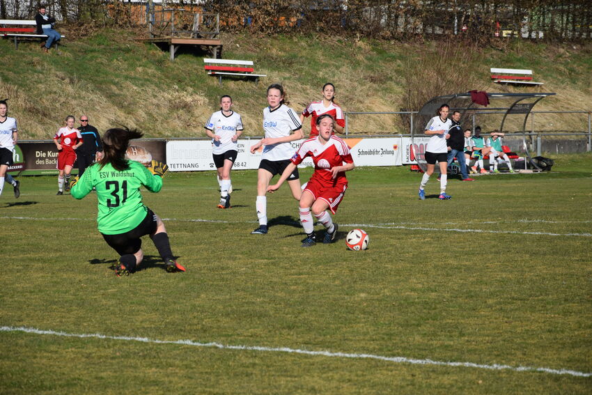 In einem zerfahrenen Spiel gewinnen die TSV-Juniorinnen letztendlich verdient mit 6:0. Die Heimelf hatte in der Anfangsphase schwierigekeiten ins Spiel zu finden. Waldshut störte früh und hatte die Führung auf dem Fuß, doch TSV-Torfrau Alexa Gragnato verhinderte die Gästeführung.