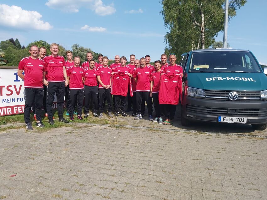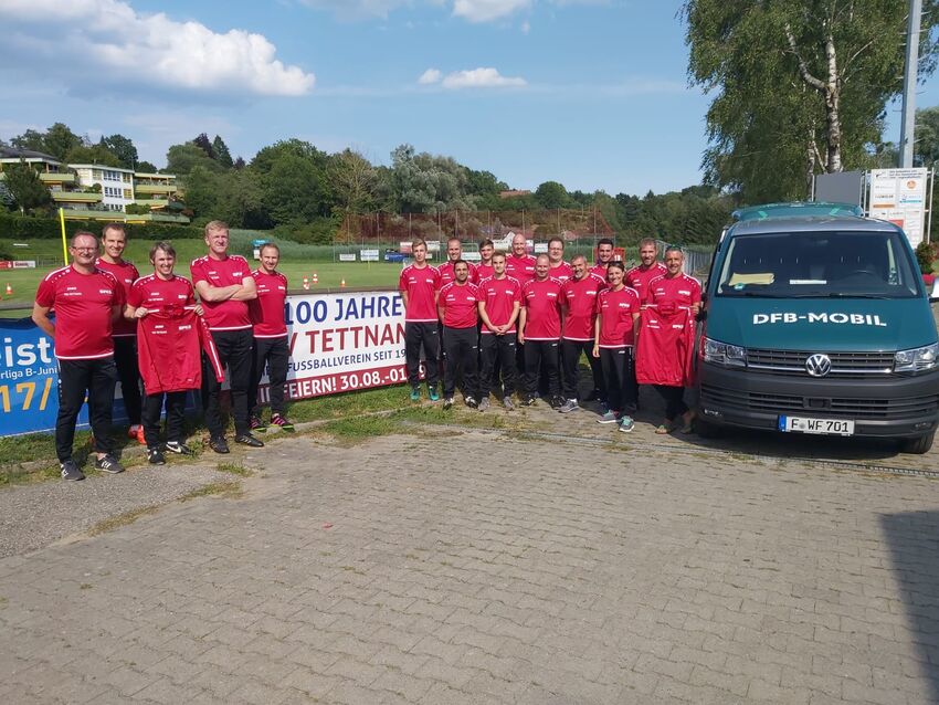 Das DFB-Mobil mit seiner Infoveranstaltung machte auch im Tettnanger Ried halt, hier ließen sich unsere Jugendtrainerinnen und Jugendtrainer von den DFB-Trainern Werner Weber und Dino Salerno schulen.