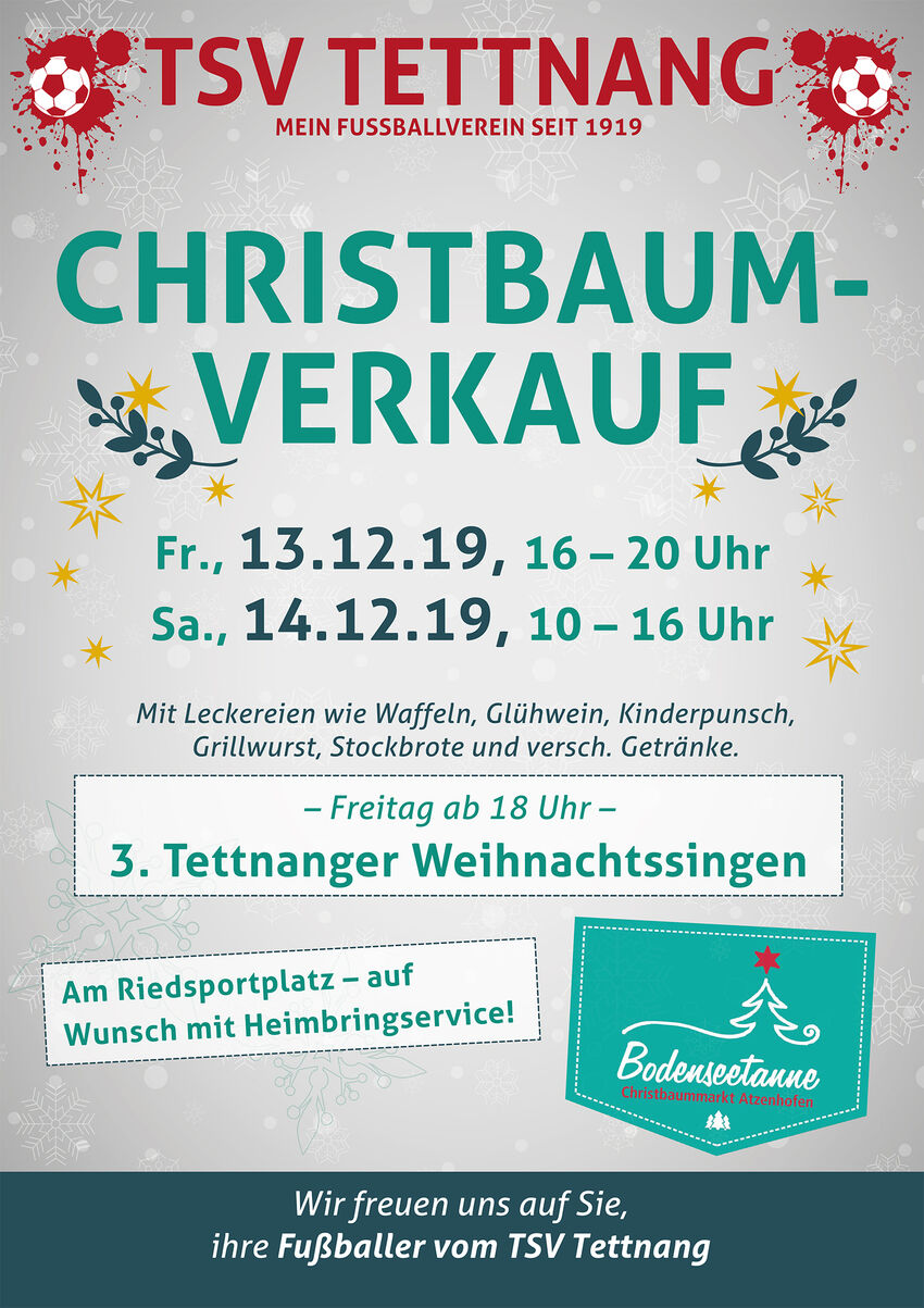 Auch dieses Jahr, am Freitag, 13.12. und Samstag, 14.12.2019, findet wieder der Christbaumverkauf auf dem Sportplatz im Ried (beim Freibad) statt.