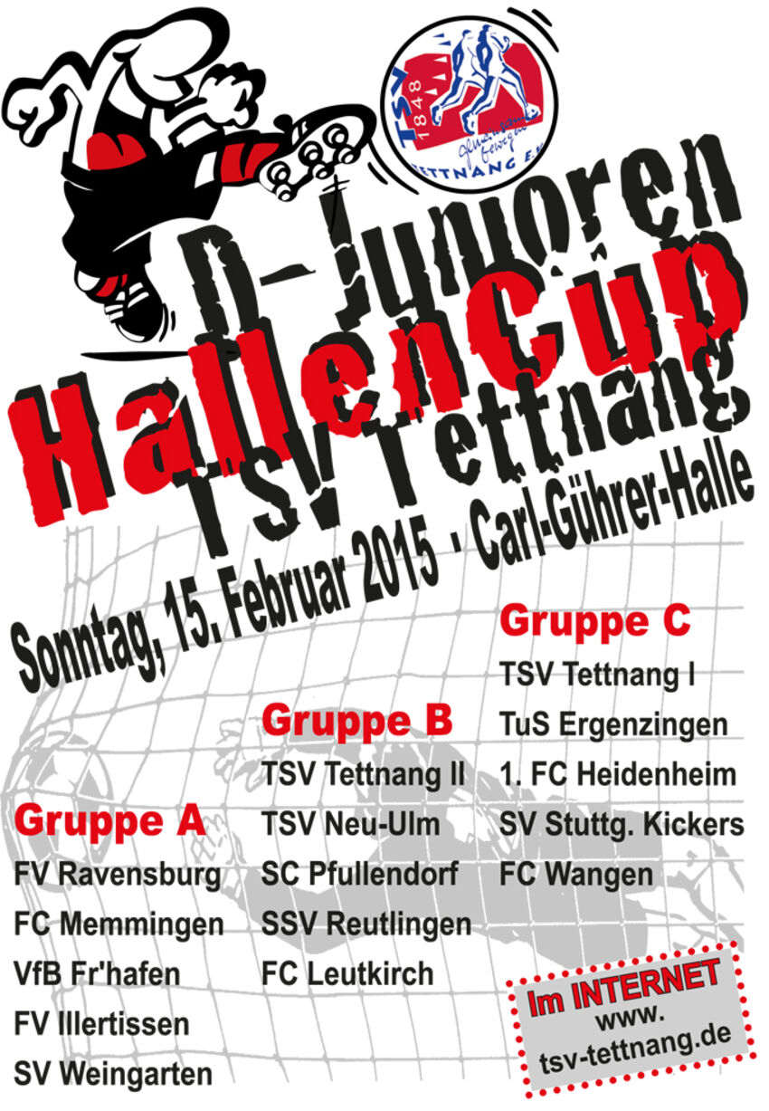 Am Sonntag, 15.02.2015 findet in der Carl-Gührer Halle der D-Junioren Hallencup statt. Folgende 15 Mannschaften nehmen in drei 5er Gruppen teil.