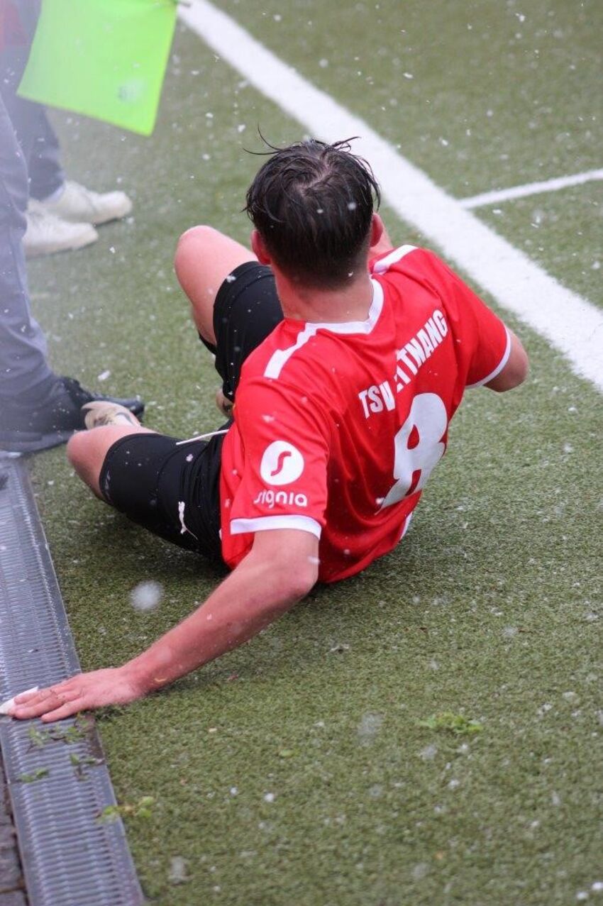 Außerdem war den Spielern das äußerst emotionale Hinspiel noch gut in Erinnerung und so war die Motivation trotz der Ausfälle von Sebastian Rapp und kurzfristig auch von Luka Rasch und Mustafa Baboli von Anpfiff an auch deutlich zu spüren. Nach ausgeglichener Anfangsphase kam der TSV immer besser ins Spiel und hatte Mitte der ersten Halbzeit einige Freistöße aus vielversprechender Position zu verzeichnen. Einen davon trat Nico Meissner aus 18 Metern Entfernung scharf auf das lange Eck, wo der Torspieler zunächst noch mit Hilfe des Pfostens klären konnte. Den von dort abprallenden Ball konnte allerdings Tim Braun gedankenschnell über die Linie bugsieren, und so lag der TSV bereits in der 18. Minute mit 0:1 in Front.
