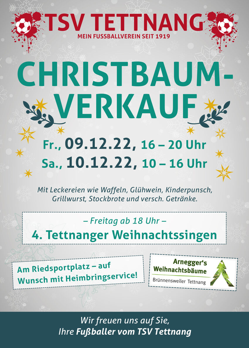 Die Fußballabteilung des TSV Tettnang lädt ganz herzlich zum Christbaumverkauf im Tettnanger Riedstadion ein. Der Christbaumverkauf findet am Freitag, den 09.12.2022 von 16 bis 20 Uhr und am Samstag, den 10.12.2022 von 10 bis 16 Uhr statt. Auf Wunsch auch gerne mit kostenlosem Heimfahrservice.