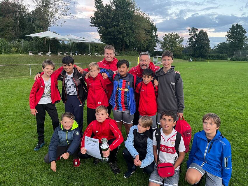 Mit elf Spielern reiste der TSV Tettnang 2 am 10.09. nach Herlazhofen zum D2-Vorbereitungsturnier. Glücklicherweise spielte das Wetter trotz schlechter Prognose mit und die Jungs konnten bei idealen Verhältnissen das Turnier bestreiten. Im ersten Spiel der Saison stimmte die Ordnung noch nicht, was aber auch ganz normal ist. Somit ging es 0:4 verloren und das sorgte zu Beginn leider für hängende Köpfe. Nach einer Umstellung der Formation war Tettnang im zweiten Spiel gegen den Gastgeber klar im Vorteil und spielte sich durch gute Kombinationen mehrere Chance heraus, die Jungs verpassten nur ein Tor zu erzielen. Nach der Gruppenphase war Tettnang mit dem Gastgeber punkt- und torgleich auf Platz 2 und mußte ins 9 Meter Schiessen, das erfolgreich und klar mit 4:2 entschieden wurde. Alle 4 Elfmeter waren klasse geschossen und Lian Hoppe im Tor machte einen guten Job. Im Halbfinale gegen den TSV Kottern 2 wurde die Formation auf Defensiv umgestellt und mit etwas Glück und einer überragenden Torwartleistung stand es nach 10 Minuten immer noch 0:0 gegen einen wirklich starken Gegner. Dann kam die Zeit des TSV und durch zwei toll herausgespielte Konter und einer 100%-igen Chancenauswertung stand es nach 15 Minuten durch die Tore von Rebin Abo und Louis Zerneke 2:0 für Tettnang - Das Finale war zum greifen nahe. Etwas unglücklich fielen dann doch noch zwei Gegentreffer zum 2:2 und das anschließende 9 Meter Schiessen ging leider klar verloren. Somit bestritten die Tettnanger Jungs das Spiel um Platz 3 gegen den FC Isny 2 und zeigten erneut eine sehr gute Leistung, nur das Tor fehlte und es bleib beim 0:0. Wiederum ging es in ein 9 Meter Schiessen, das wirklich spannend war - nach 5 Schützen stand es 3:3. Im letzten Duell waren die Tettnanger dann erfolgreich, Lian Hoppe hielt und sein Bruder Finn behielt die Nerven und erzielte das entscheidende 4:3. Stolz und zufrieden wurde der Pokal für den 3. Platz entgegen genommen und die Tettnanger Jungs starten mit einem ersten positiven Erlebnis in die neue Saison.