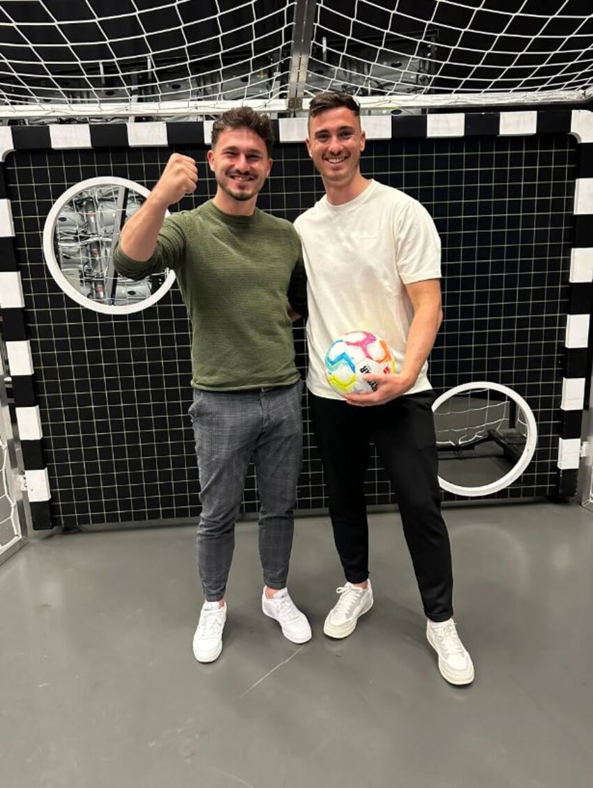 Nach seinem 85-Meter-Tor darf der Fußballer des TSV Tettnang an der Torwand gegen einen Bundesliga-Spieler ran. Und mit dem versteht er sich auf Anhieb hervorragend.