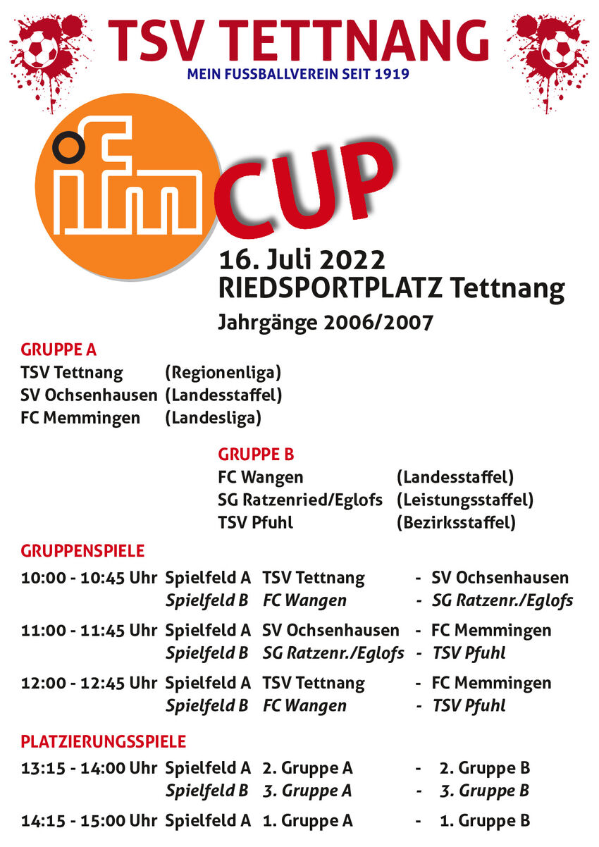 Eine Nummer kleiner, aber wer weiß was künftig noch kommt, geht es um den IFM-Cup 2022 und den gestifteten Siegerpokal. Hier schon mal ein herzliches Dankeschön an unseren Hauptsponsor die ifm. Eine tolle Partnerschaft mit einem tollen Unternehmen, wie auch das 50 jährige Firmenjubiläum vor ein paar Jahren zeigte, als der TSV Tettnang mit über 200 Personen, diese Jubiläum mitbegleitete und mitbewirtete. Wir freuen uns sehr auf die teilnehmenden Vereine, die allesamt seit Jahren eine ausgezeichnete Jugendarbeit betreiben und die letzten Jahre regelmäßig schöne Erfolge in diesen Altersbereichen feiern durften.