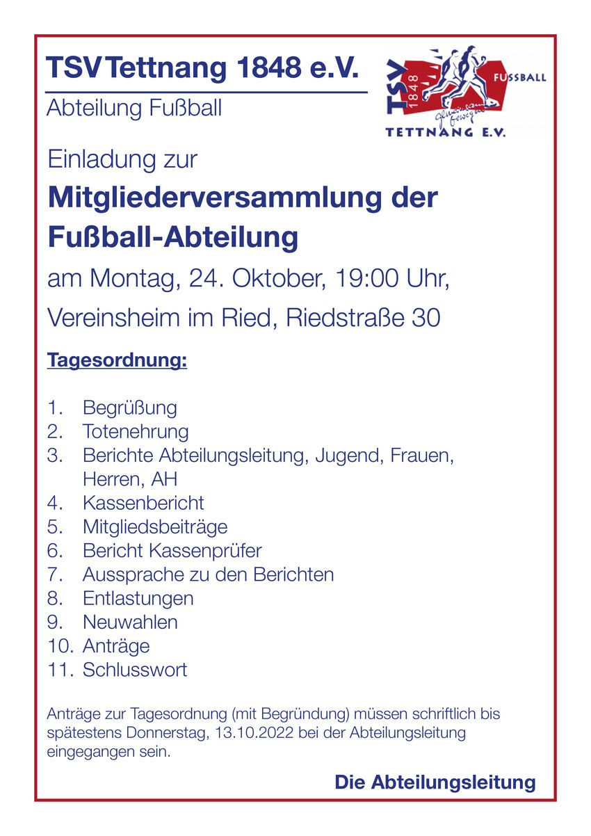 Am Montag 24. Oktober findet um 19:00 Uhr im Vereinsheim im Ried die Jahreshauptversammlung der TSV-Fußballer statt.