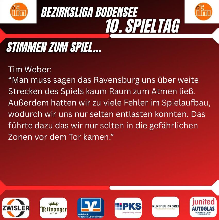Ravensburg nutzte seine Chance eiskalt und ging in Führung. Als wir dem Ausgleichstreffer näher waren gab es die kalte Dusche, der FV baute die Führung aus.Nach großem Einsatz erzielten wir den Anschlusstreffer, mussten aber im direkten Gegenzug leider den dritten Gegentreffer hinnehmen.