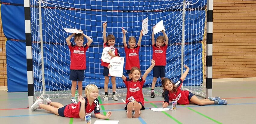 Ihren dritten Spieltag der Saison absolvierten die Minis der JSG Bodensee am vergangenen Samstag Auswärts beim TV Weingarten. Auf dem Programm der Minis standen dieses Mal ein Parkour, wie bei Ninja Warrior, gefolgt von mehreren Runden Nummernball und Aufsetzerhandball. Als erstes ging es an den Parkour welcher mit Elementen zum Hangeln, Klettern, Schwingen und Balancieren aufgebaut war. Anschließend ging es nach einer kleinen Pause zum Nummernball Spiel, bei welchem sich die Minis ehrgeizig gezeigt und ihre Aufgaben in den verschiedenen Ecken so schnell wie es ging nach dem Pass erledigt haben. In der ersten Halbzeit vom Aufsetzerhandball war es ein ausgeglichenes Spiel, so stand es zur Pause 5 : 5. In der zweiten Halbzeit konnten sich unsere Minis letztendlich doch mit einem klaren 9 : 7 gegen die Gastgeber im Aufsetzerhandball durchsetzen. Der Handballnachwuchs war nach dem Spiel ganz verwundert darüber, dass der Spieltag jetzt schon zu Ende ging. Bei der Siegerehrung sah man bei allen Kindern glückliche und strahlende Gesichter.