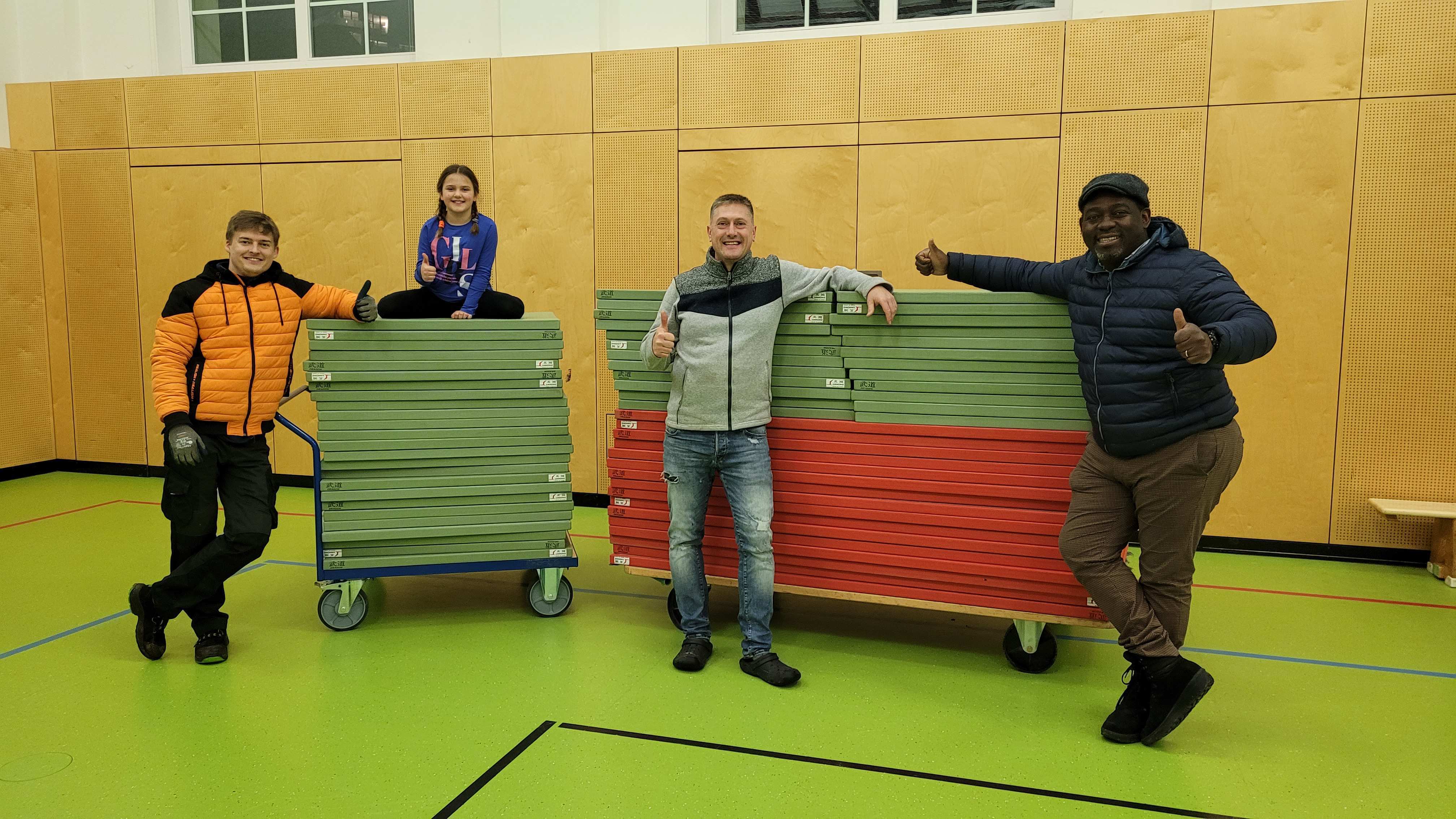 Mit gemeinsamen Kräften und einem großen Hänger wurden die Tatami-Matten in die Turnhalle an der Weinsstraße eingebracht. Damit sind die Voraussetzungen für das Training, Vorführungen und Wettkämpfen gegeben.