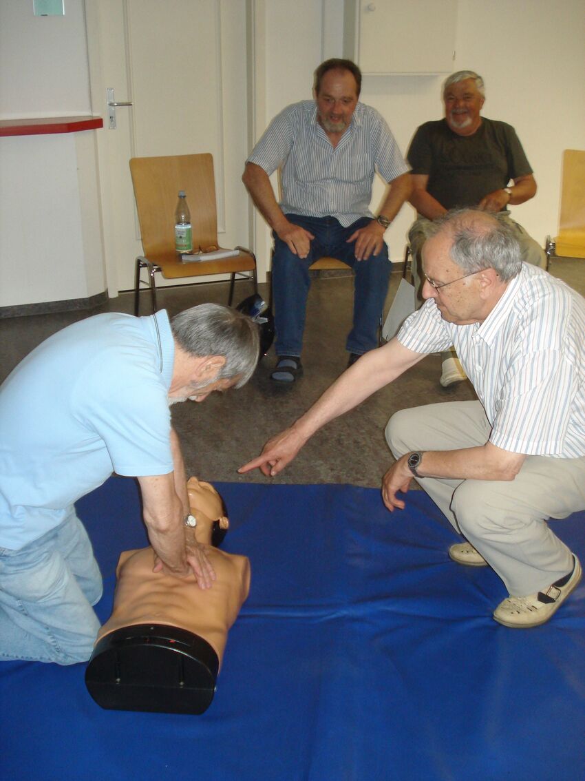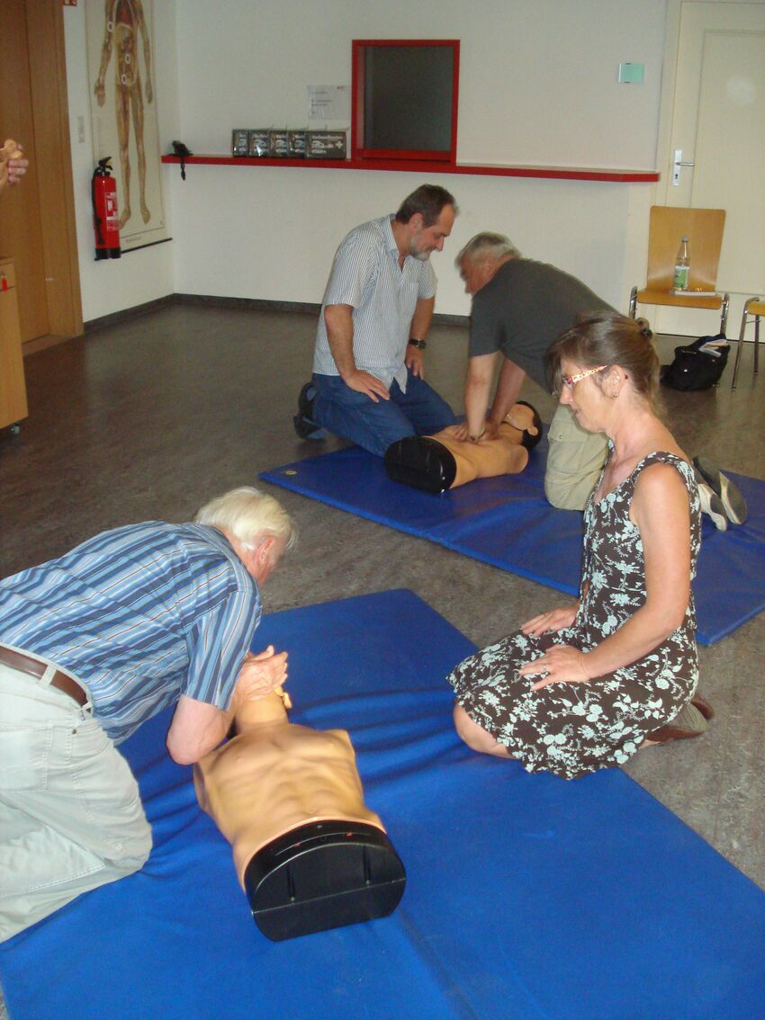 Kursinhalte waren: allgemeine Auffrischung, theoretische und praktische Schulung/Übung der stabilen Seitenlage, Anwendung des Defibrillators AED sowie die Herz-Lungen-Wiederbelebung.
