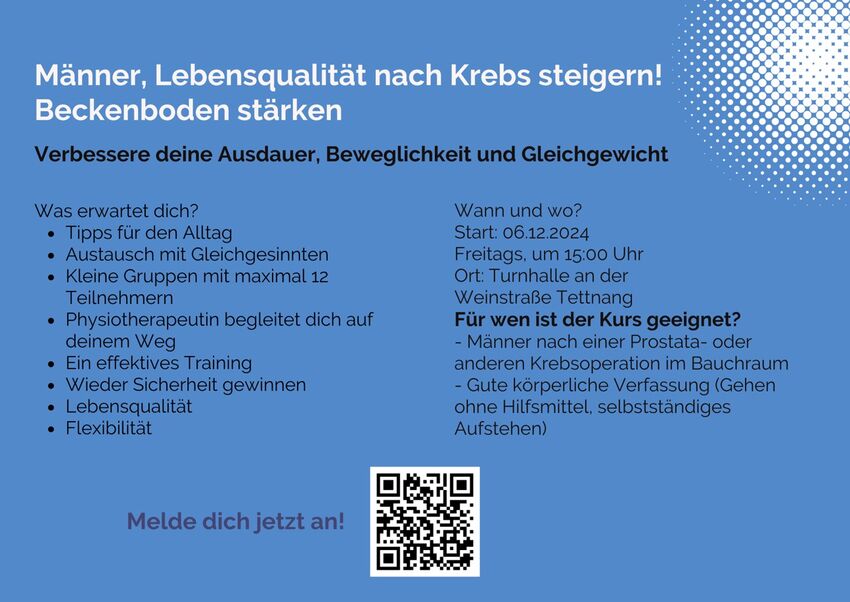 “Sport nach Krebs - MÄNNER” ist auf die speziellen Bedürfnisse nach einer Prostata OP oder einer anderen Krebsoperation im Bauchraum ausgerichtet. In einer kleinen geschlossenen Gruppe begleitet Dich unsere Physiotherapeutin, um zügig nach dieser belastenden OP wieder Sicherheit und bessere Lebensqualität zu erhalten.