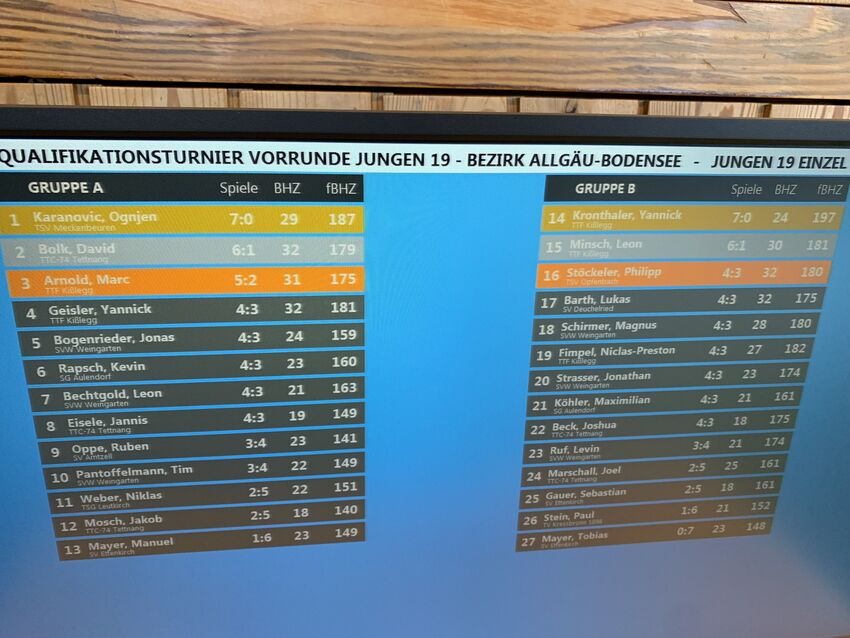 David Bolk als Zweiter mit 6:1 Siegen und Jannis Eisele als Achter mit 4:3 Siegen qualifizierten sich dabei für die Endrunde des Bezirks. Joshua Beck mit ebenfalls 4:3 Siegen wurde unglücklich Neunter und scheiterte knapp am Weiterkommen.