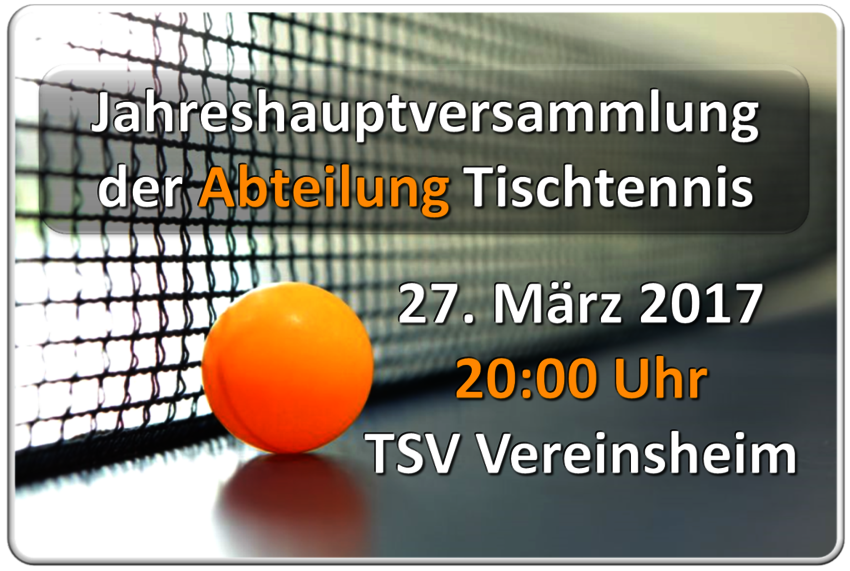 Am Montag, den 27. März 2017 lädt der Tischtennisclub 74 Tettnang, im TSV 1848 Tettnang e. V., alle seine Mitglieder zu seiner Jahreshauptversammlung ein. Man trifft sich um 20.00 Uhr im TSV- Vereinsheim , beim Sportplatz Ried in Tettnang.