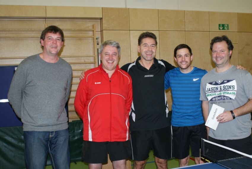 Abteilungsleiter Stefan Geßler begrüßte nachmittags die Aktiven zu ihren Spielen, wobei die Teilnehmerzahl etwas hinter den Erwartungen zurück blieb. Bei den Gruppenspielen gab es keine großen Überraschungen und die Favoriten setzten sich durch. In den Viertelfinals siegten Markus Eser gegen Stefan Geßler , Alexander Zick gegen Philipp Junginger, Christian Mutzel gegen Markus Schmidt und mit großer Mühe Simon Rösch nach dem Entscheidungssatz gegen Siegfried Merath. Spannend verliefen die Halbfinals. Hierbei gewann Eser mit etwas Glück und Nervenstärke nach fünf knappen Sätzen gegen Rösch. Mutzel behielt mit 3:1 gegen Zick die Oberhand. Im Endspiel spielte Eser kompromoslos auf und holte sich gegen Mutzel überzeugend den Meistertitel. Den dritten Platz belegte Rösch.