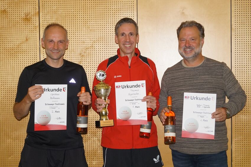 Bei den Aktiven konnte Abteilungsleiter Siegfried Merath ebenfalls ein großes Teilnehmerfeld begrüßen. Nach einer kurzen Ansprache übergab er an Turnierleiter Karl Knöpfler, welcher nach der Gruppenauslosung souverän das Turnier leitete. Nach spannenden und zum Teil sehr ausgeglichenen Gruppenspielen standen die Viertelfinals an. Hierbei setzte sich Thomas Egelhofer nach drei Sätzen gegen Simon Schobloch durch, Christian Hoffmann gewann ebenfalls mit 3:0 gegen Philipp Junginger, Stefan Merath behielt ebenfalls nach drei Sätzen die Oberhand gegen Fabian Wizemann und etwas überraschend gewann Christian Mutzel mit 3:1 gegen Titelverteidiger Markus Eser. Die Halbfinalspiele endeten jeweils 3:0, wobei die Sätze nicht so deutlich waren wie das Endergebnis. Dabei setzte sich Egelhofer gegen Stefan Merath und Hoffmann gegen Mutzel durch. Im Endspiel gab es tolle offensive Ballwechsel und vier knappe Sätze, wobei sich mit Thomas Egelhofer gegen Christian Hoffmann auch der Favorit durchsetzen konnte. Nicht ausgespielt wurde der dritte Platz. Den teilten sich Christian Mutzel und Stefan Merath. In der Doppelkonkurrenz war wiederum Thomas Egelhofer, zusammen mit Markus Eser, im Endspiel. Sie gewannen mit 3:1 Sätzen gegen Simon Schobloch/ Fabian Wizemann und holten sich so den Titel. Den dritten Platz belegten Karl Knöpfler/ Stefan Merath. Das Turnier war wieder bestens organisiert und eine gute Vorbereitung auf die neue Saison.
