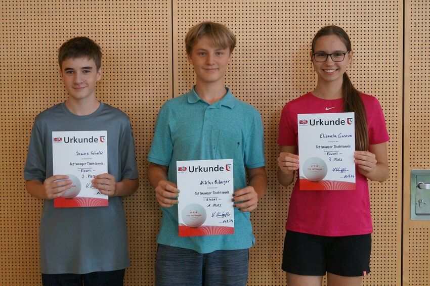 Der Tischtennisclub Tettnang war in seinem 50 jährigen Jubiläumsjahr an der Reihe, die Stadtmeisterschaften auszutragen. Einmal mehr war es wieder ein gut organisiertes Turnier mit vielen spannenden und hochklassigen Spielen. Jugendleiter Karl Knöpfler durfte ein großes Teilnehmerfeld bei den Jugendlichen begrüßen. Es war auch wieder Nachwuchs vom SSV Kau mit am Start. Nach hartumkämften Gruppenspielen holte sich dann im Endspiel Niklas Biberger mit 3:1 Sätzen gegen Jonas Schalk den Titel. Im kleinen Finale war es Elisaveta Guseva, wo sich gegen ihre Schwester Varvara durchsetzen konnte und sich damit den dritten Platz sicherte. Bei der Doppelentscheidung waren es Niklas Biberger/ Moritz Schalk, welche sich im Endspiel gegen Sarah Schofield/ Noah Niemeyer durchsetzen konnten. Den dritten Platz belegten Liam Bürmann/ Linus Landmann.