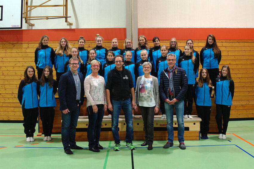 Die gesamte Turnabteilung wurde mit neuen Trainingsanzügen ausgestattet. Dank der tollen Unterstützung der Firmen Schuh + Sport Mohn und Zahntechnik Schmieder sowie des Fördervereins für das Leistungsturnen können die Turner nun wieder in einheitlichem Look Turnfeste und Wettkämpfe besuchen. Unser Bild zeigt (vorne von links) Turn-Geschäftsführer Oliver Schneider, Silvia Pfeiffer vom Förderverein, Wolfgang Mohn von Schuh + Sport Mohn sowie Ursula und Markus Schmieder von Zahntechnik Schmieder zusammen mit einem Großteil der Leistungsturngruppe bei der Übergabe der Anzüge.