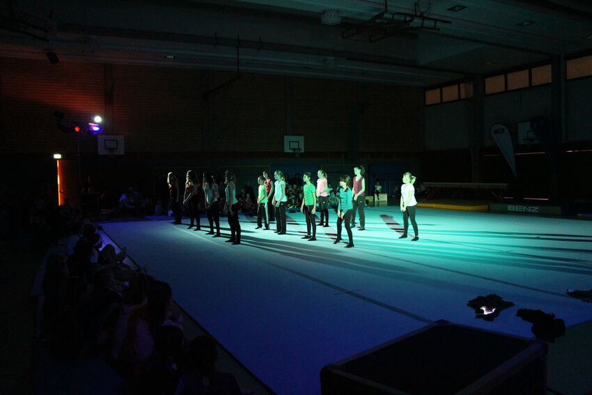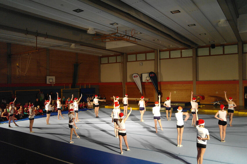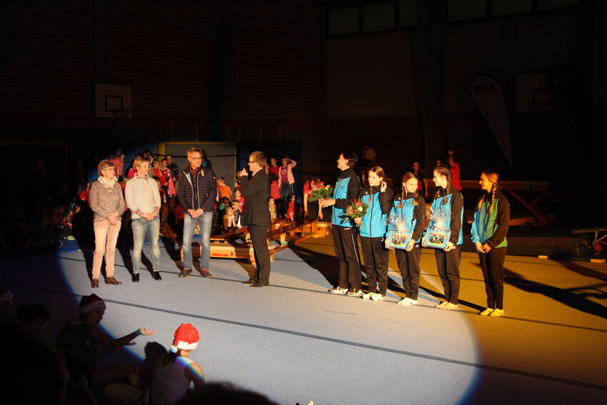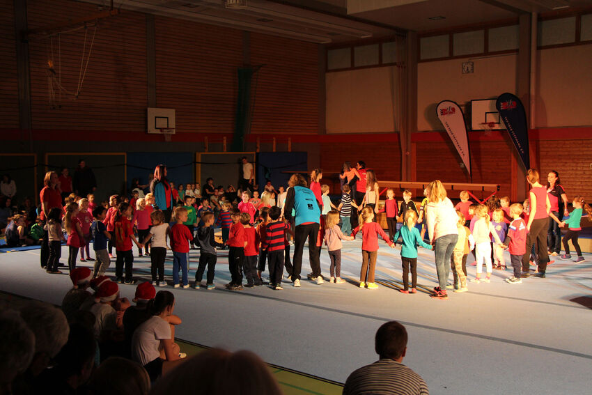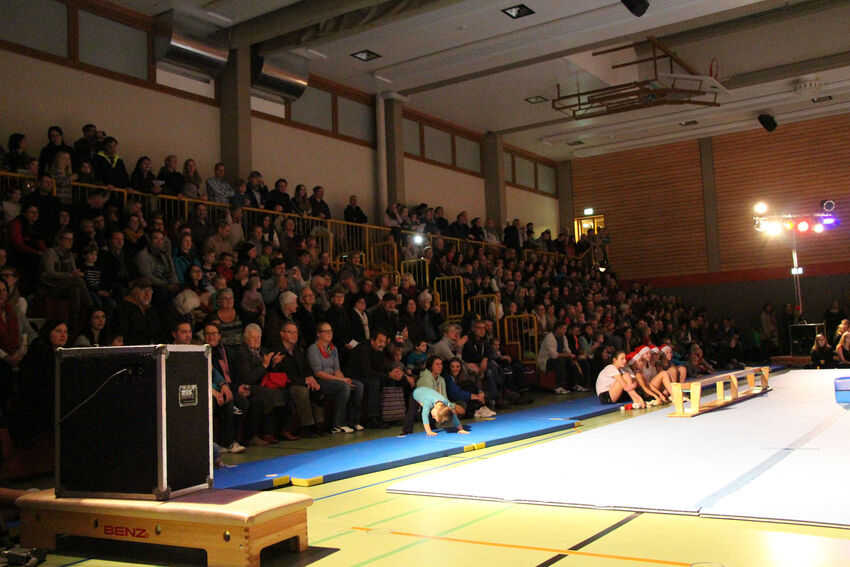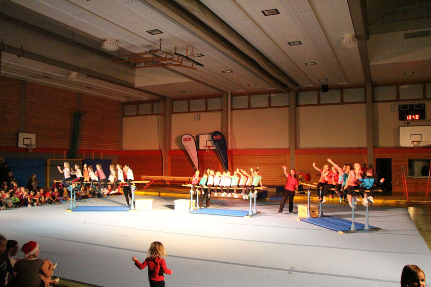 Auf Märchenreise begaben sich die D- bis F-Jugendturnerinnen der Leistungsturngruppe. Zur Musik des Disney-Animationsfilms „Die Eiskönigin“ zeigten sie eine schöne Bodenformation mit vielen überraschenden Elementen. Viel Spaß vermittelten auch die Jungs der Hit-for-Kids-Gruppe. Die Sechs- bis Zehnjährigen spielten zunächst ein waghalsiges Fange-Spiel auf 12 kleinen Kästen, bevor sie diese zu Trommeln umfunktionierten. Das ganze zu toller Musik, gute Unterhaltung für Augen und Ohren. „Flashlight Daning“ zeigte dann die Gruppe Mädchen:TURNEN! Jeweils mit einer Taschenlampe ausgestattet, gaben die jungen Damen eine außergewöhnliche Light-Show im Dunkeln. Den Abschluss dieser schönen Vorführung bildete ein launiger Tanz auf Hip-Hop-Musik, beides im Übrigen von den elf bis 14 jährigen Mädchen selbst gestaltet und mit Hilfe der Übungsleiterin einstudiert. Die Leistungsturnerinnen ab der C-Jugend bildeten einen würdigen Abschluss und zeigten die ganze Bandbreite ihres Könnens. Unter Einsatz aller Geräte entführten die 25 Turnerinnen die Zuschauer ins Winterwonderland. So manches neue Element entlockte den Zuschauern begeisterten Szenenapplaus, bevor die Darbietung in einer schönen Pyramide endete.