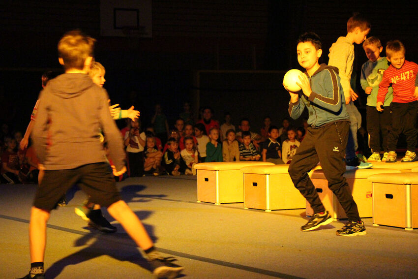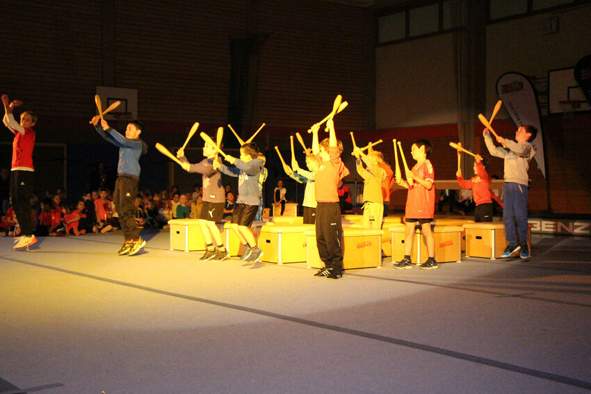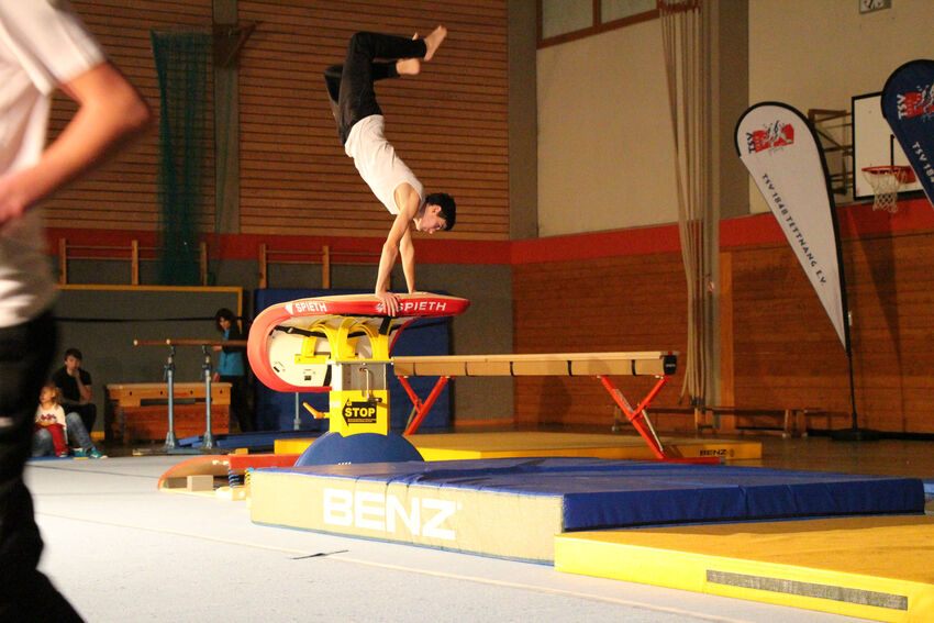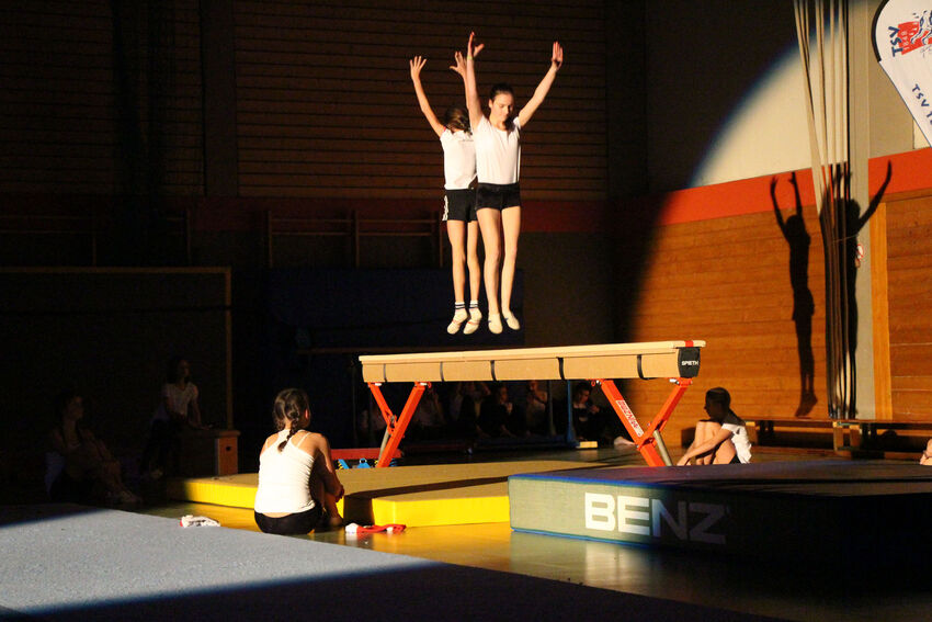 Alle Kinder- und Jugendgruppen der Turnabteilung zeigten, was sie das Jahr über gelernt haben. So konnte die Abteilung ihr ganzes Spektrum an Angeboten präsentieren. Den Anfang machten die Kinder der Eltern-Kind-Gruppen. Sie zeigten, dass man nicht immer viele große oder kleine Geräte braucht, um mit großem Spaß turnen zu können. Die Kinder der Vorschulgruppen übten im Vorfeld fleißig das Springen übers Trampolin und das Stützen auf dem Barren. Ensprechend toll gaben sie dann auch ihre Übungen bei der Vorführung zum Besten. Die jungen Männer der Gruppe Jungs:TURNEN! übernahmen den Geräte-Aufbau von den Kleinen und fühlten sich selbst an ihre Vorschul-Turnzeit erinnert. Mit waghalsigen Saltos übers Mini-Trampolin zeigten sie aber auch, was sie in den letzten Wochen gelernt haben. Die Mädchen der Hits-for-Kids-Gruppe turnten ebenfalls am Barren und zeigten nicht nur klassische Elemente, sondern auch Hänge- und Balancier-Übungen. Flotte Aerobic-Schritte zu peppiger Musik rundeten den Auftritt ab.