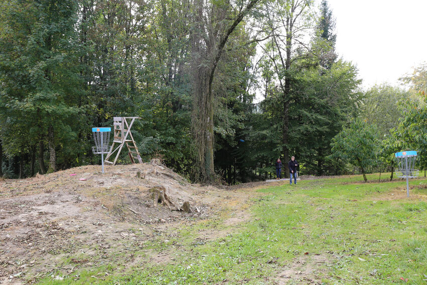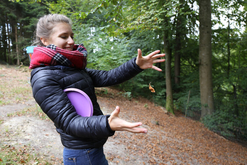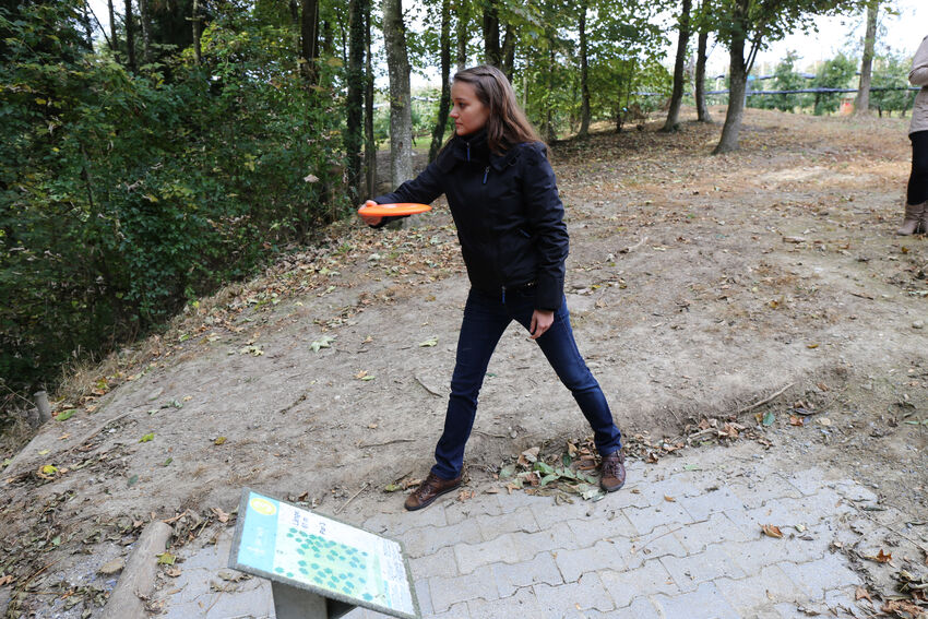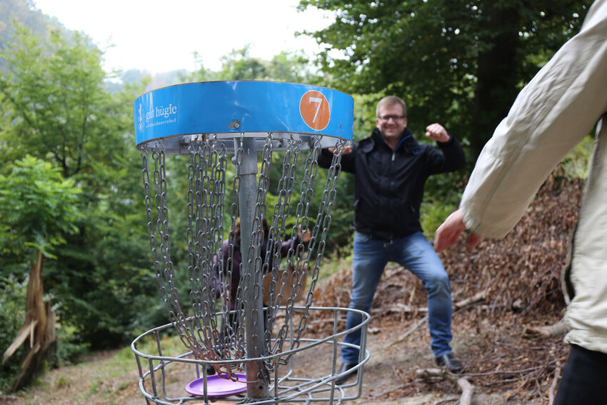 Gott sei dank gab es auf der Anlage einen fachkundigen Spezialisten, der die Turner geduldig in die bislang unbekannte Sportart einführte. Nach den ersten Probewürfen, die mehr oder weniger ihr Ziel fanden, teilten sich die Turner eilig in drei Gruppen auf und nahmen den Parcour mit seinen 9 Bahnen in Angriff. Dabei lagen Erfolg und Misserfolg eng beieinander, was bei den teilweise recht anspruchsvollen Bahnen nicht weiter verwunderte. Wobei Seufzer der Verzweiflung deutlich öfter durch Wald und Wiesen hallten als Freudenschreie. Auf jeden einigermaßen gelungenen Wurf folgte fast sicher ein Baum- oder Buschtreffer. Und wenn bei weit entferntem Ziel die grobe Wurf-Richtung endlich mal passte, brach das Sportgerät sicher am Ende der Flugbahn aus unerklärlichen Gründen wieder stark nach rechts oder links aus. Besonders beliebt war auch das Wegrollen der Scheibe, die sich nach einem beinahre-Treffer des Korbes auf die Seite stellte und erst am unteren Ende des Hügels wieder zum liegen kam. Dem Spaß tat all das jedoch keinen Abbruch. Und als der Parcour bewältigt war, hatten die meisten noch lange nicht genug und begaben sich erneut auf die Bahnen.