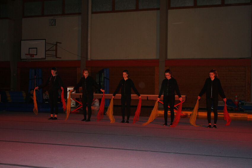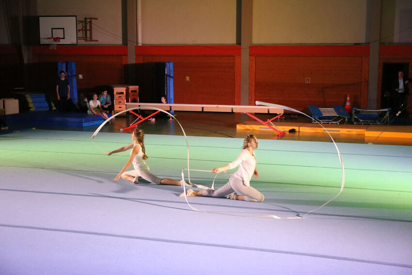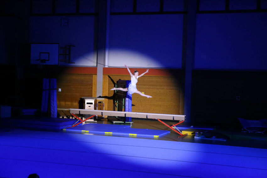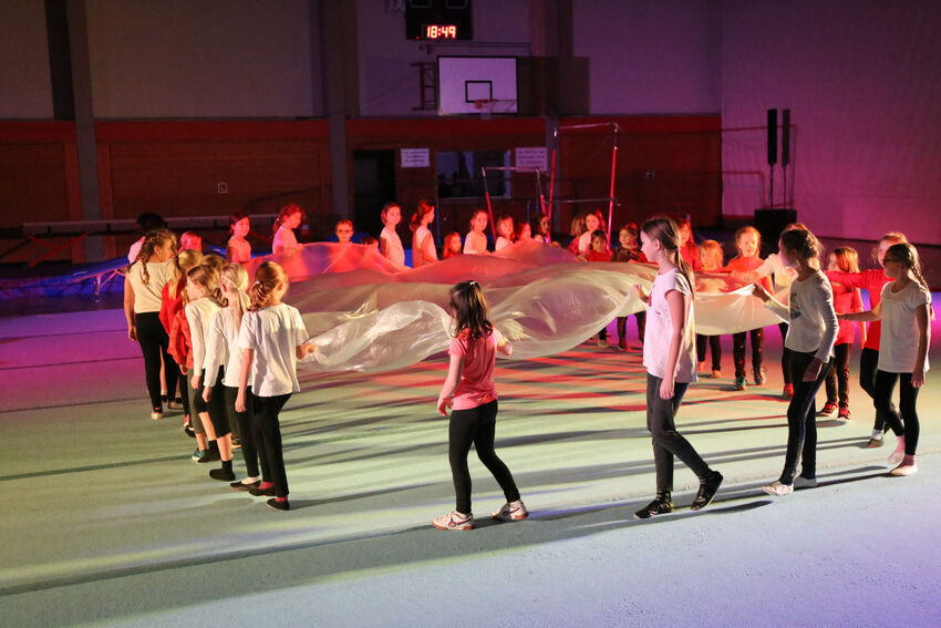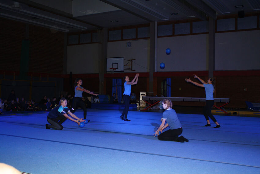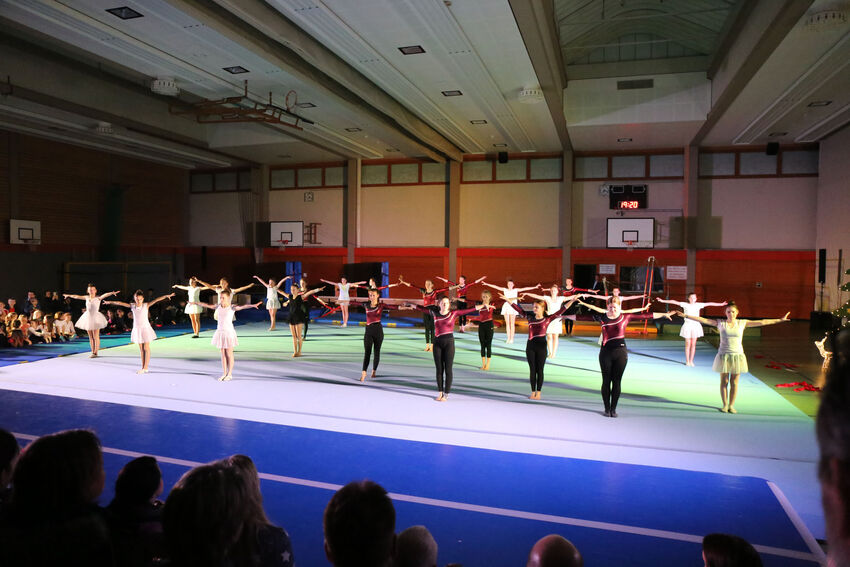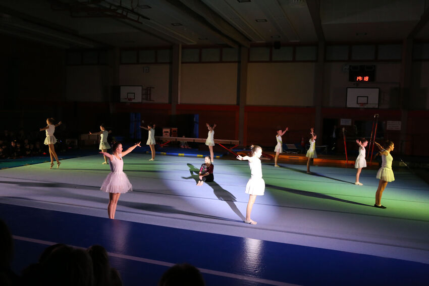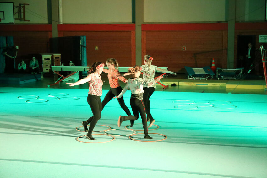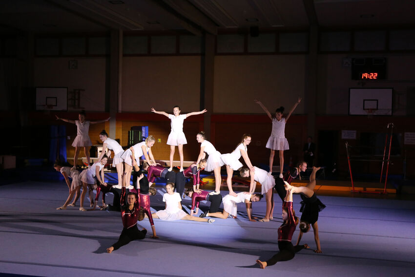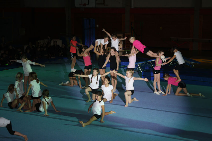 Die jüngeren Turnerinnen der Leistungsturngruppe begaben sich dann auf Märchenreise und erzählten die Geschichte von Rapunzel. Dabei kamen verschiedene Turngeräte zum Einsatz, die Mädchen zeigten sich aber auch von ihrer aktobatischen Seite mit tollen Partner-Salti und Pyramiden. Die vier Elemente Luft, Erde, Feuer und Wasser hatte die Gruppe Mädchen:Turnen zum Thema. Die elf bis 14-jährigen Turnerinnen teilten sich dabei in vier Gruppen auf und zeigten ihre großteils selbst überlegten Choreografien mit Bändern, Bällen, Reifen und Tüchern. Den Abschluss bildeten die älteren Leistungsturnerinnen ab der C-Jugend. Auf die Musik des Balletts "Schwanensee" zeigten die Turnerinnen tolle Bodenformationen, aber auch Übungsauszüge an Schwebebalken und Stufenbarren sowie Akrobatik auf dem Airtrack. So manches Element entlockte den Zuschauern begeisterten Szenenapplaus, bevor die Darbietung in einer schönen Pyramide endete.