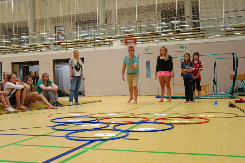 Natürlich sollte nicht nur anstrengendes Training den Alltag bestimmen, das Trainerteam war durchaus auch darum bemüht, ein abwechslungsreiches Rahmenprogramm zu bieten. So wurde in den Pausen fleissig am Airtrack geturnt, abends gabs Spiele und Filme. Einizg der traditionelle Besuch im Maislabyrinth in Nitzenweiler fiel ins Wasser. Kaum war die Gruppe vor Ort, begann ein heftiger Gewitterschauer, der den Besuch des Labyrinths leider unmöglich machte. So mußte man sich unverrichteter Dinge wieder auf den Heimweg machen, wobei der Schmerz darüber durch ein ausgegebenes Eis wenigstens teilweise wieder gelindert werden konnte. Der Höhepunkt war aber wie immer die „Turnwochen-Show“ am letzten Abend. Das Pro-7-Format „Schlag den Raab“ war das Vorbild für eine Show, bei der die Turnerinnen in verschiedenen Spielen und Quizes gegen ihren Trainer antreten mussten und am Ende promt die Oberhand behielten.