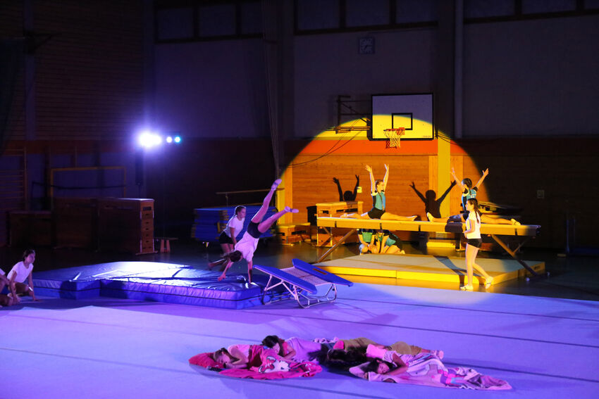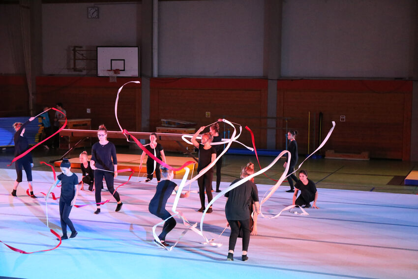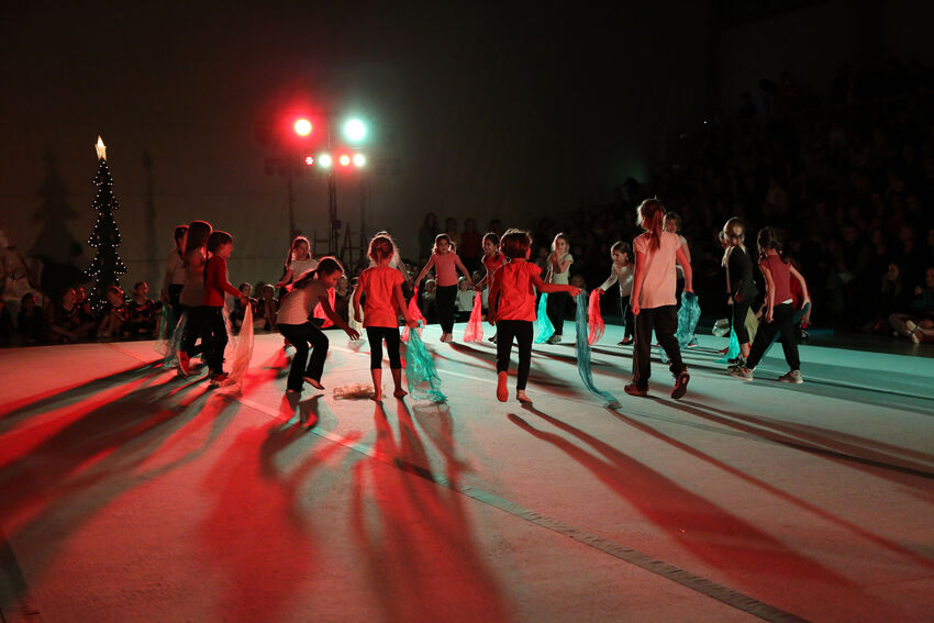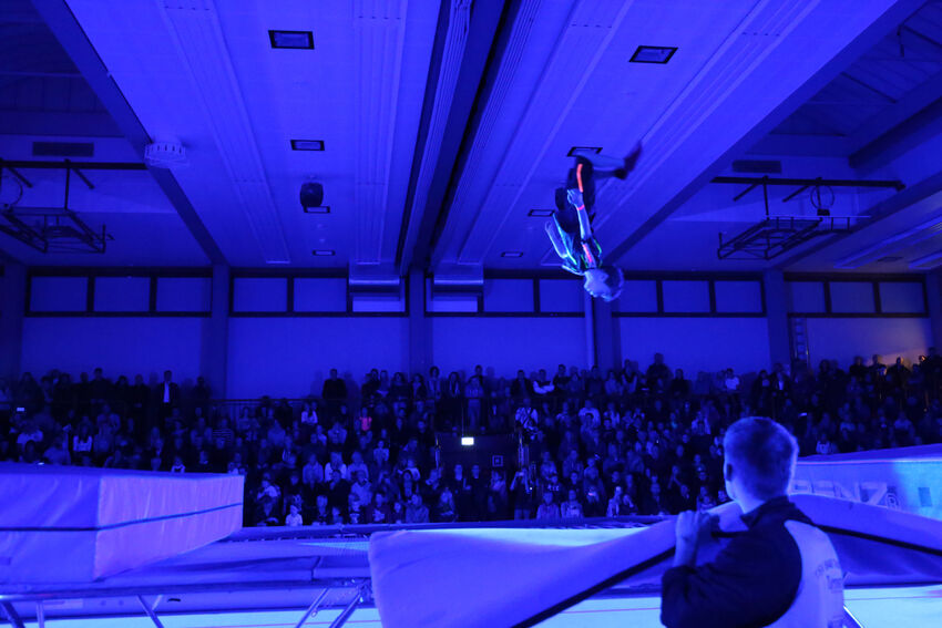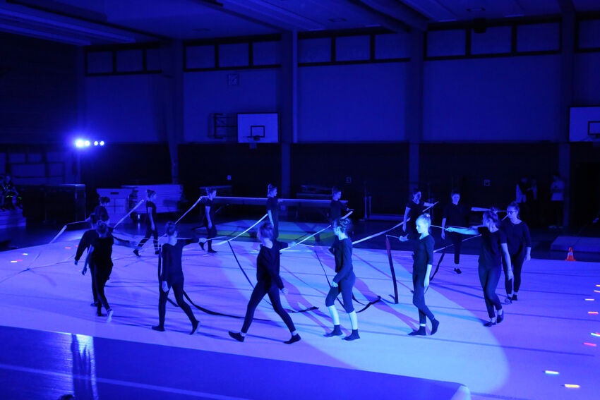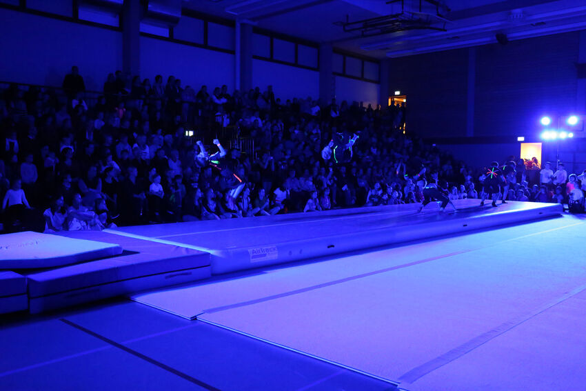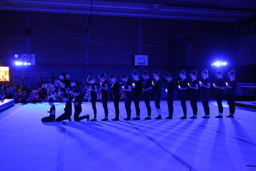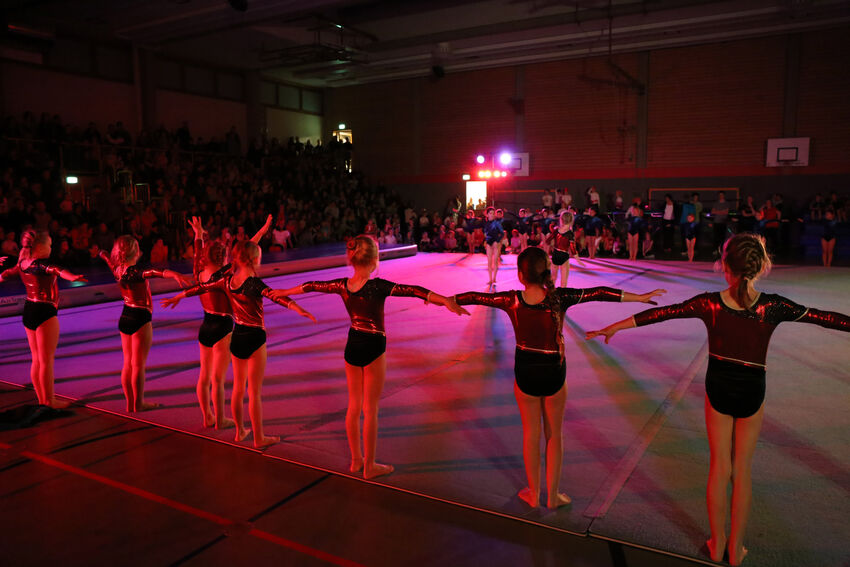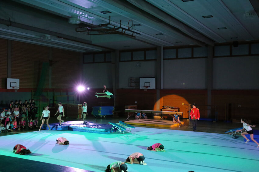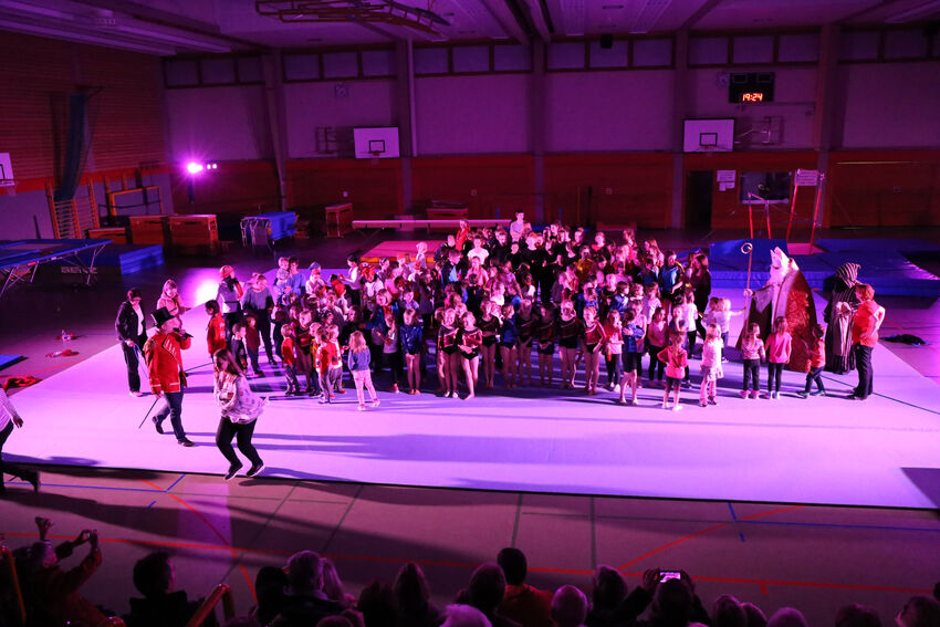 Actionreich war dann wieder die Darbietung der Gruppe Jungs:Turnen: Die 11 bis 15 jährigen Jungs begeisterten das Publikum mit waghalsigen Sprüngen auf dem Airtrack und dem großen Trampolin. Die jüngeren Turnerinnen der Leistungsturngruppe begaben sich dann auf Märchenreise und erzählten die Geschichte von Barbie und der Freundschaft in Form einer schönen Bodenvorführung. Selbst kreativ war die Gruppe Mädchen:Turnen. Die elf bis 14-jährigen Turnerinnen zeigten eine Kombination aus Lichtspielen und Formationen mit dem aus der rhythmischen Sportgymnastik bekannten Band. Die drei ältesten Teilnehmerinnen der Gruppe hatten die Choreografie selbst entwickelt. Den Abschluss bildeten die älteren Leistungsturnerinnen ab der C-Jugend. Sie entführten das Publikum in die große Welt des Zirkus. „The Greatest Show“ erzählte turnerisch die Geschichte der kleinen Lena und ihrer Freunde, die so gerne Teil einer großen Zirkus-Vorführung sein wollten und das am Ende auch schafften. Dabei waren verschiedene Turngeräte einschließlich des akrobatischen Airtracks im Einsatz. Zum Ende kamen alle Akteure nochmals auf die Bühne und holten sich die Anerkennung von Publikum und vom Nikolaus ab – vom Publikum in Form von verdientem Applaus, vom Nikolaus in Form eines kleinen Geschenks.