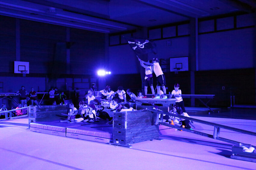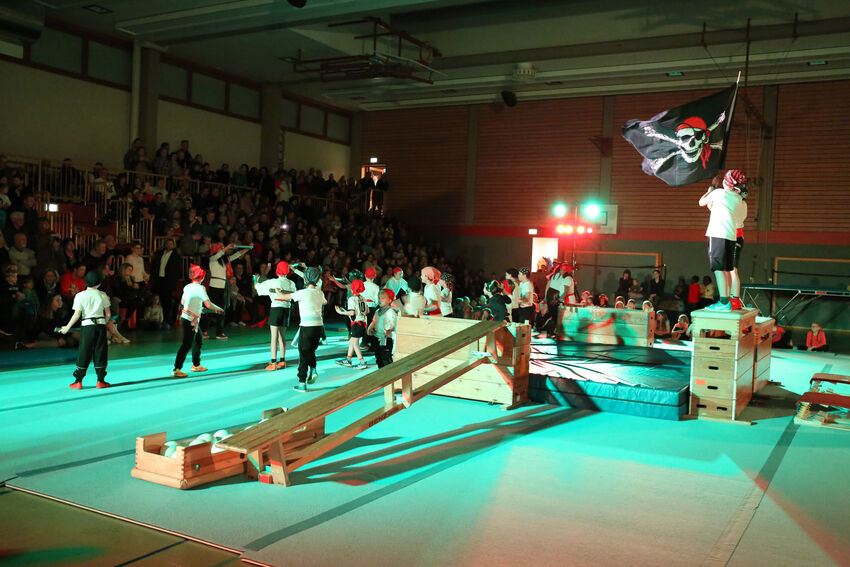 Die Kinder der Vorschulgruppe aus der Carl-Gührer-Halle entführten die Zuschauer auf die Piste. Warm eingepackt mit Handschuhen und Mütze kurvten die Kinder im Pulverschnee um die Turnstangen. Ganz anders das Bild bei der Vorführung der Gruppe Hits for Kids Jungs: Die sechs bis zehnjährigen Turner enterten als Piraten lauthals die Turnerinsel und hissten ihre Piratenflagge. Die gleichaltrigen Mädchen waren da etwas ruhiger unterwegs, zeigten sie doch mit ihren Tüchern eine anmutige Bodenformation und balancierten über Bänke, begeisterten damit aber nicht weniger.