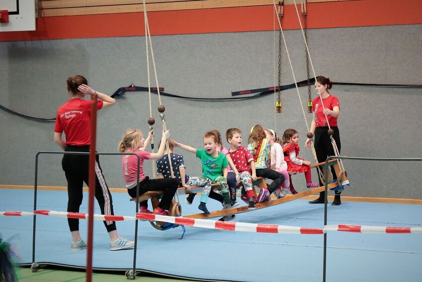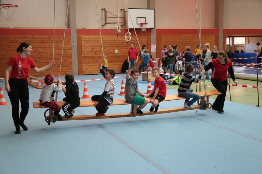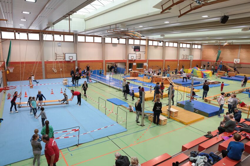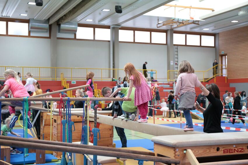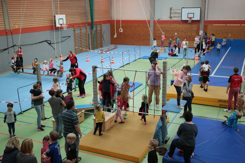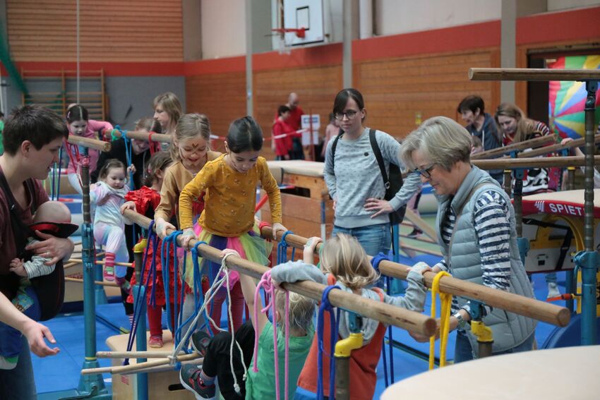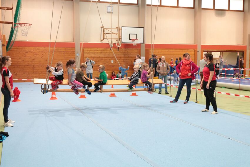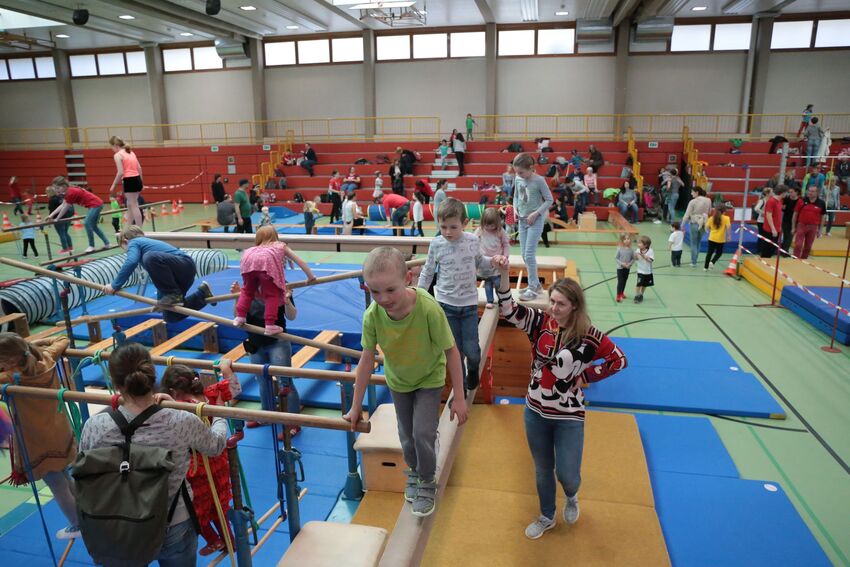 Klettern, schwingen, hüpfen, balancieren, rennen: Die TSV-Turnabteilung verwandelte die Carl-Gührer-Halle am Wochenende in eine riesige Bewegungslandschaft. Überall waren tolle Turngeräte soweit das Auge reichte, zum Drübersteigen oder Durchkriechen. Mini-Trampolin, Rutsche, Seile zum Schwingen, Airtrack - alles war vorhanden, was die Kinder brauchten, um sich auszutoben. Vor allem die Riesenschaukel, aber auch die Gruselhöhle und der Rollbrett-Parcours erfreuten sich großer Beliebtheit. Während die Kleineren im für sie abgetrennten Spielbereich die verschiedenen Geräte erkundeten, tobten sich die Größeren auf der akrobatischen Airtrackbahn aus.