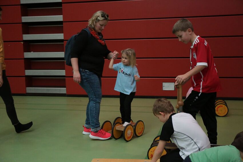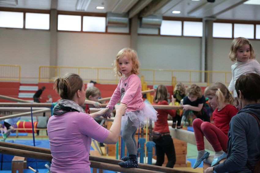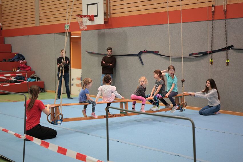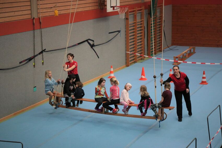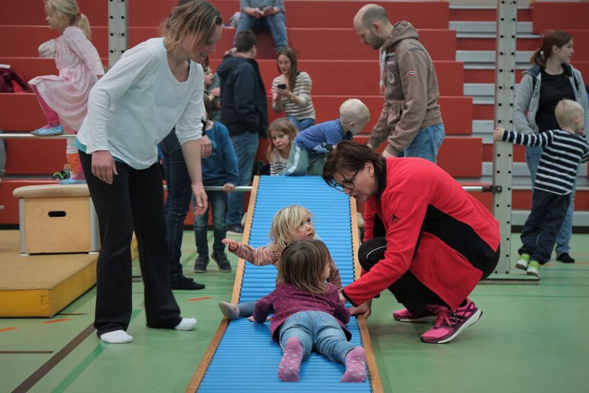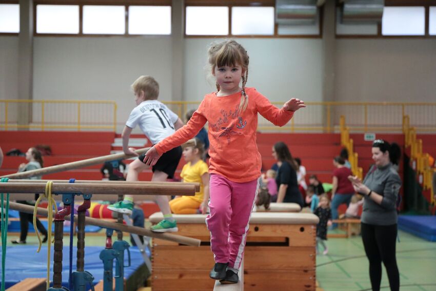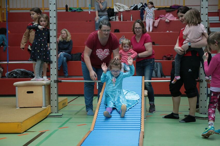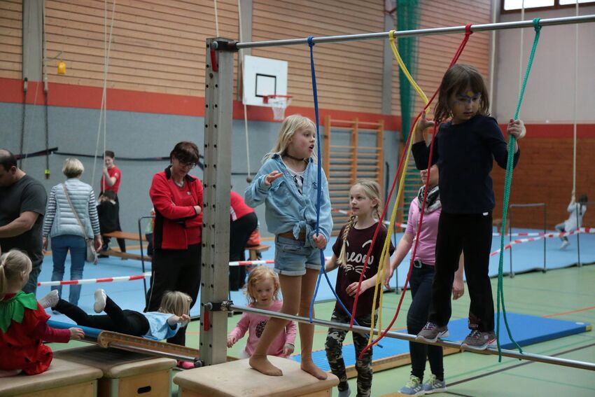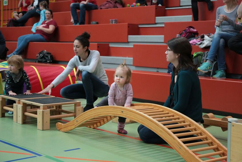 Klettern, schwingen, hüpfen, balancieren, rennen: Die TSV-Turnabteilung verwandelte die Carl-Gührer-Halle am Wochenende in eine riesige Bewegungslandschaft. Überall waren tolle Turngeräte soweit das Auge reichte, zum Drübersteigen oder Durchkriechen. Mini-Trampolin, Rutsche, Seile zum Schwingen, Airtrack - alles war vorhanden, was die Kinder brauchten, um sich auszutoben. Vor allem die Riesenschaukel, aber auch die Gruselhöhle und der Rollbrett-Parcours erfreuten sich großer Beliebtheit. Während die Kleineren im für sie abgetrennten Spielbereich die verschiedenen Geräte erkundeten, tobten sich die Größeren auf der akrobatischen Airtrackbahn aus.