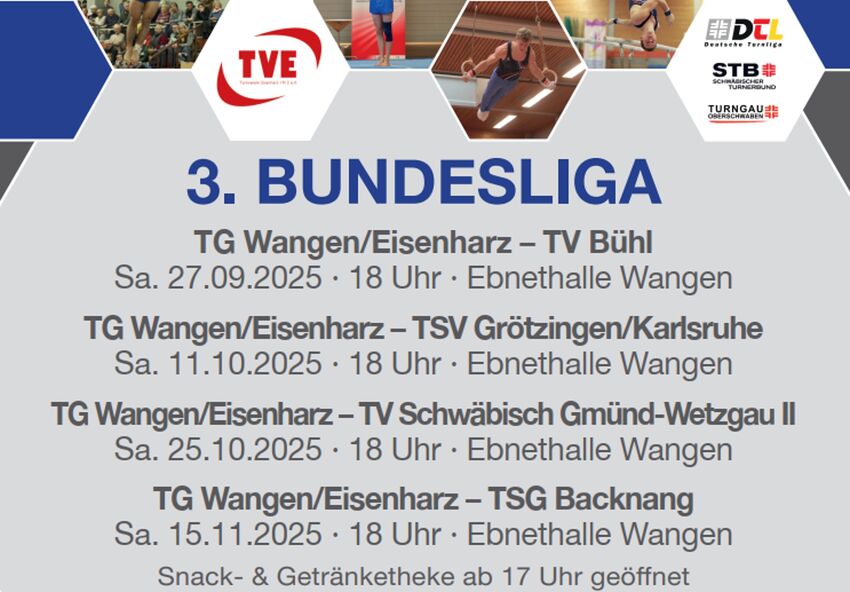 Im Turngau Oberschwaben turnt die TG Wangen/Eisenharz in der 3. Bundesliga und hat ihre vier Heimwettkämpfe in Wangen. Es erwarten Dich spannenden Wettkampfduells auf hohem turnerischen Niveau an allen sechs Männergeräten nach dem Score-Punkte System. Dauer ca. 150 min. inklusive einer kurzen Pause noch drei Geräten.