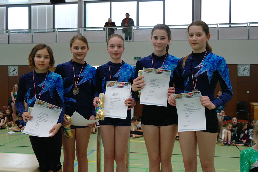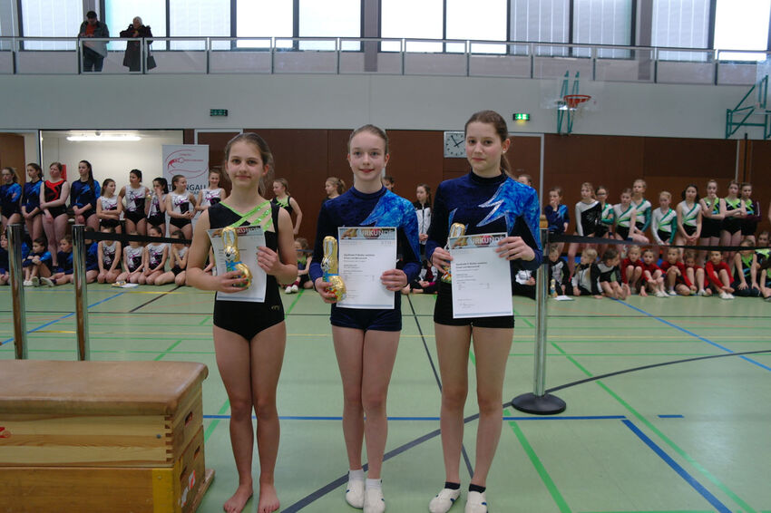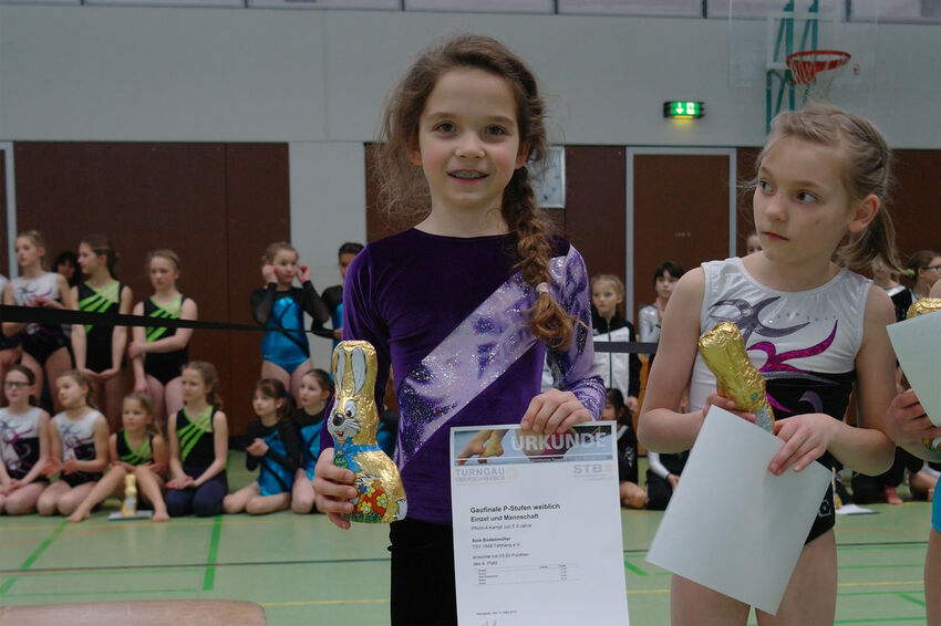 Die Kleinsten waren mit am erfolgreichsten. Bei der E8-Jugend war Selina Neuer die einzige Tettnanger Starterin. Sie zeigte eine ganz starke Übung am Schwebebalken mit 14,7 von 15 möglichen Punkten und erreichte am Ende einen sehr guten vierten Platz. Sina Bodenmüller schaffte bei der E9 die selbe Platzierung, sie konnte vor allem am Boden überzeugen. Beide Starterinnen dürfen somit zum Regionalfinale im Mai in Straubenhardt, für welches sich in allen Alterklassen die ersten sechs qualifizierten. Michelle Ebinger und Maike Nachbaur landeten im Mittelfeld. Die vier E-Jugend-Starterinnen konnten zudem in der Mannschaftswertung den dritten Platz erreichen und qualifizierten sich auch als Mannschaft für die nächste Runde.