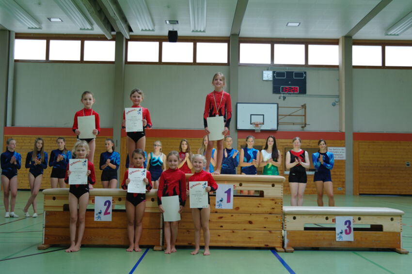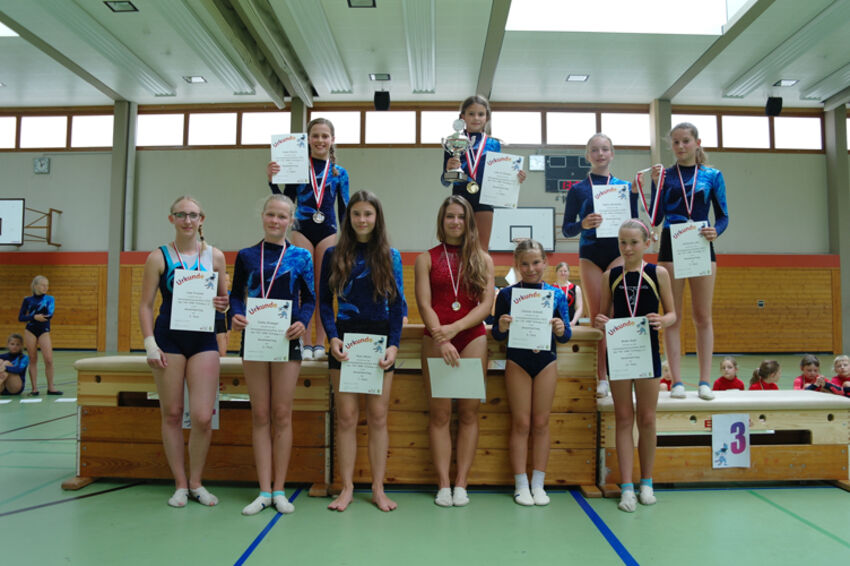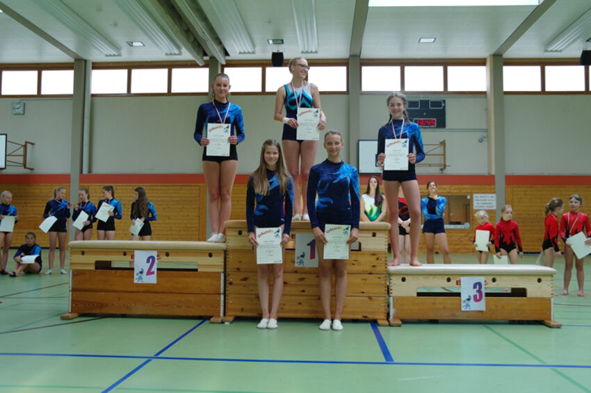 Darüber hinaus wurden als Gesamtsieger die Vereinsmeisterinnen bei den Aktiven und den Jugendlichen ermittelt. Bei den Jugendlichen wurden dazu die erturnten Einzelwertungen in eine Zehn-Punkte-Wertung umgerechnet, um die gezeigten Leistungen auch altersübergreifend miteinander vergleichbar zu machen. Die Vereinsmeisterinnen wurden mit einer großen Medaille und einer Urkunde belohnt. Neue Vereinsmeisterin des TSV Eriskirch wurde Julia Köhl, die sich mit tollen Übungen gegen Annabianca Ruatto durchsetzen konnte. Emilia Widmann und Jennifer Maier kamen punktgleich auf Rang drei.