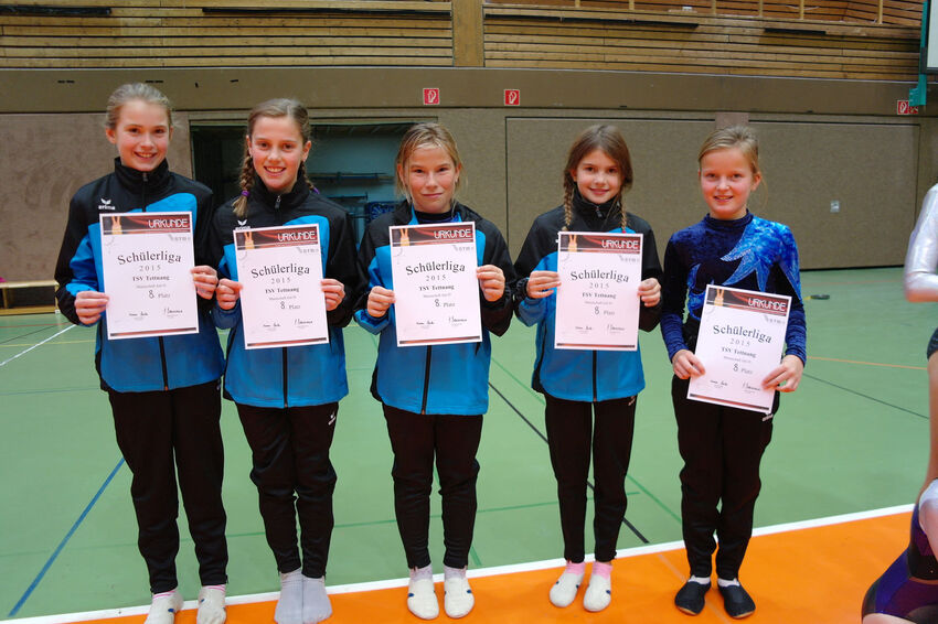 In der Vorwoche noch auf dem ersten Platz gelandet war die E-Jugend voller Hoffnung auf einen Platz auf dem Treppchen. Man zeigte auch gute Leistungen an den meisten Geräten, nur am Sprung konnte man nicht ganz an die Ergebnisse der Vorwoche anknüpfen. So kam man in Friedrichshafen auf den fünften Rang. In der Gesamtwertung war man dadurch punktgleich mit dem dritten TV Eisenharz, kam aber wegen gerade mal 0,8 Punkten weniger in der erturnten Gesamtpunktzahl auf Platz 4 und verpasste damit damit das Treppchen denkbar knapp. Die Mannschaft turnte aber immer auf Augenhöhe mit den besten Teams aus Oberschwaben und darf deshalb mit dieser Platzierung sehr zufrieden sein. Sina Bodenmüller, Michelle Ebinger, Maike Nachbaur, Selina Neuer und Sena Mermer waren für den TSV am Start.