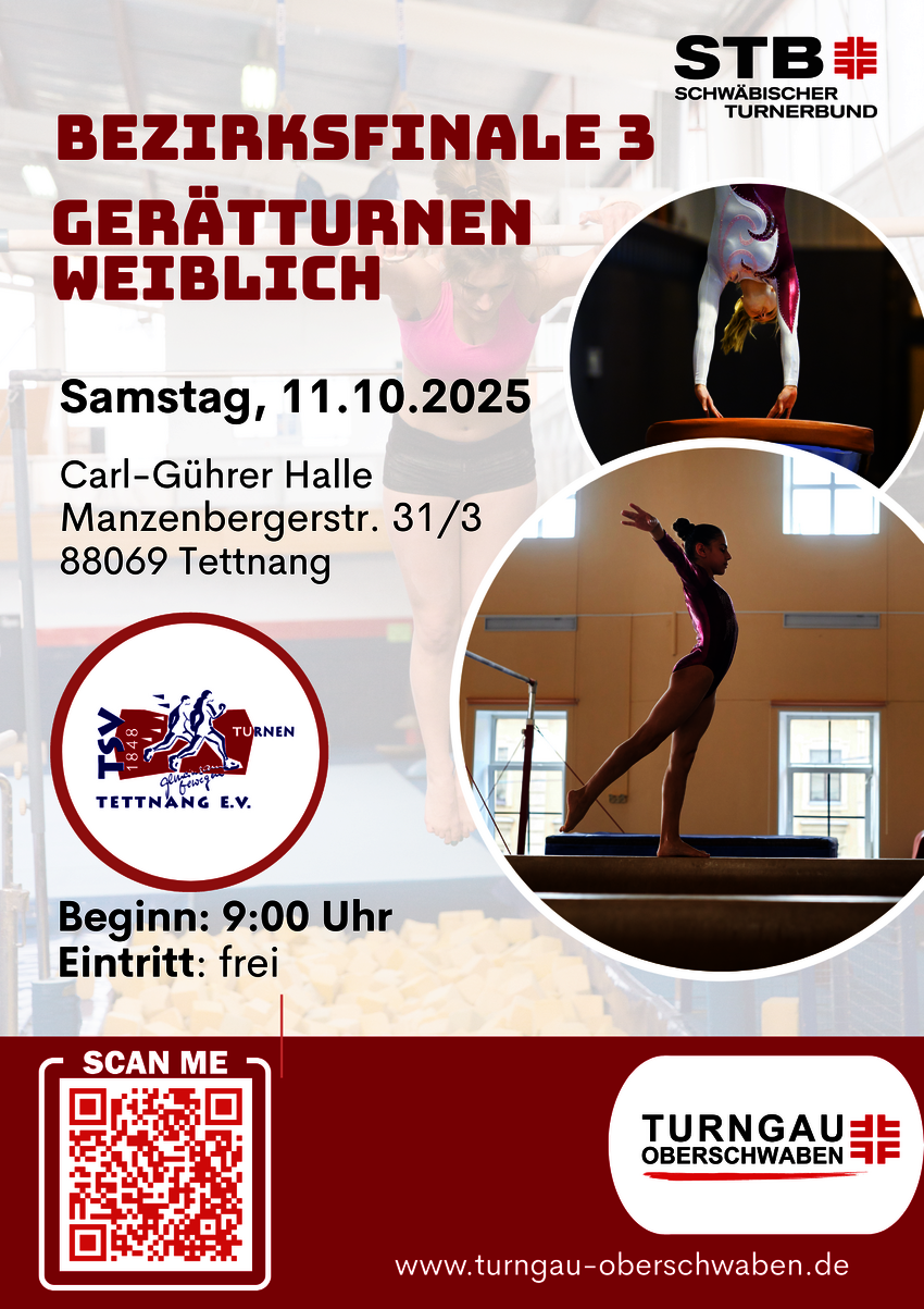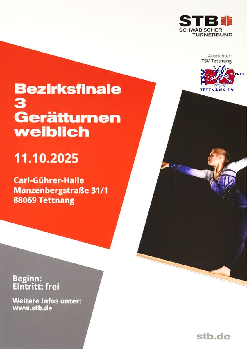 Das Bezirksfinale 3 Gerätturnen weiblich findet am 11.10.2025 ab 9:00 Uhr bis voraussichtlich 20:00 Uhr in der Carl-Gührer-Halle statt.