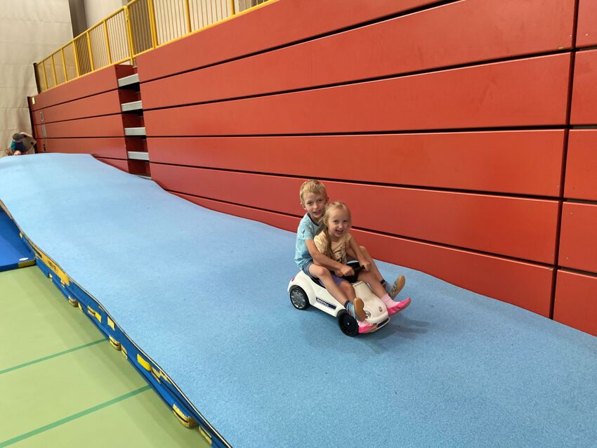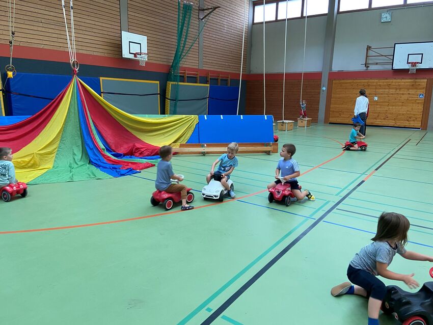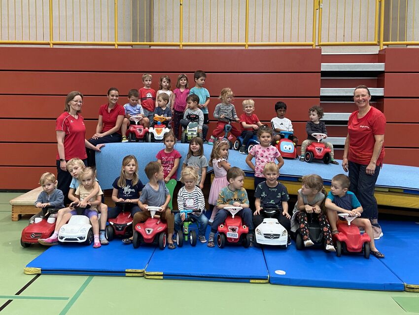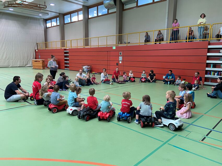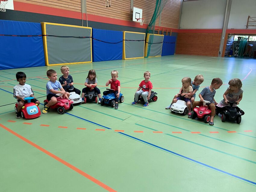 Zum Abschluss vor den Sommerferien fand für die Gruppen Hits for Kids! Eltern-Kind und Hits for Kids! Vorschule in der Carl-Gührer Halle eine ganz besondere Stunde statt: eine Fahrzeugstunde mit Bobbycar und Co!